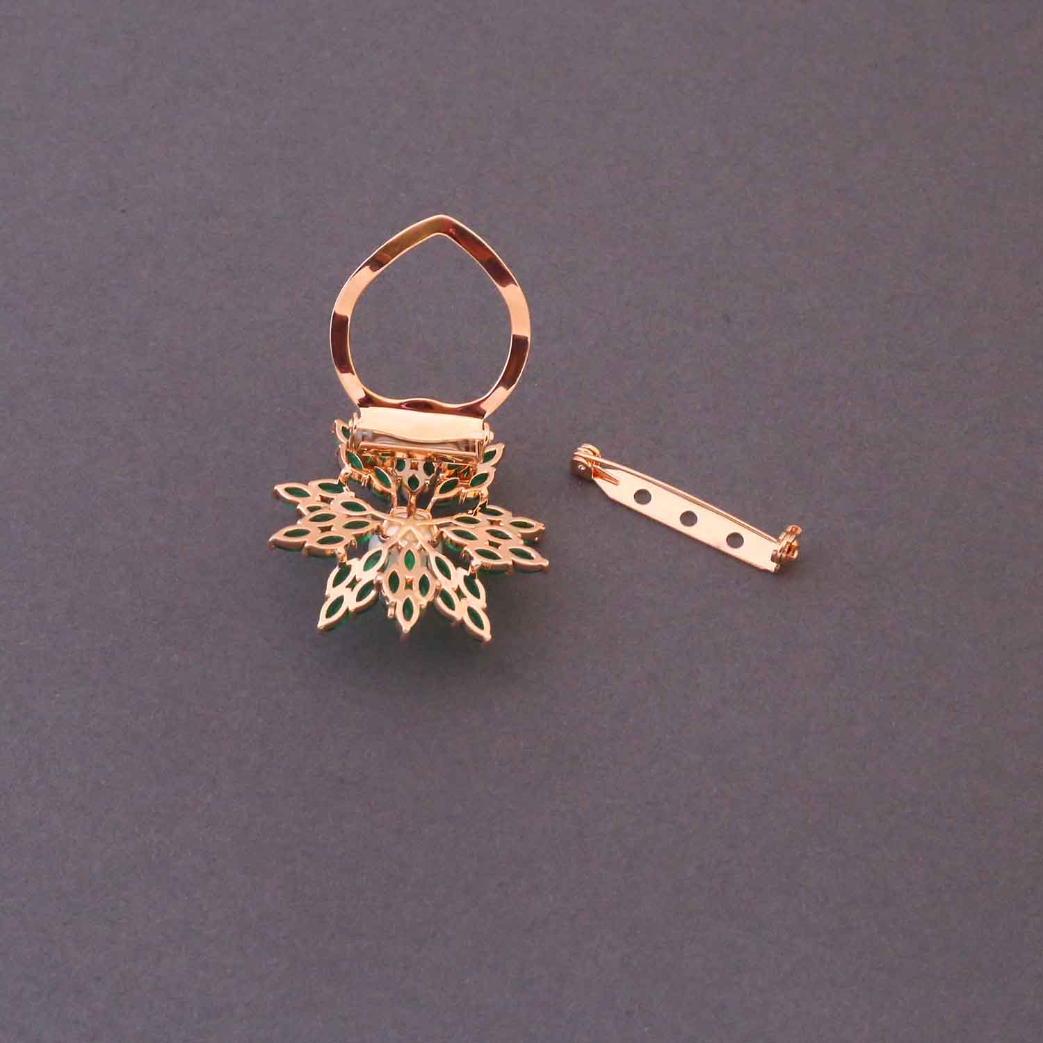 This striking brooch is designed in a radiant floral pattern, highlighted with marquise-cut stones arranged in layered petals around a smooth central bead. The symmetrical layout and fine detailing give it a bold yet elegant appearance, making it a standout accessory.