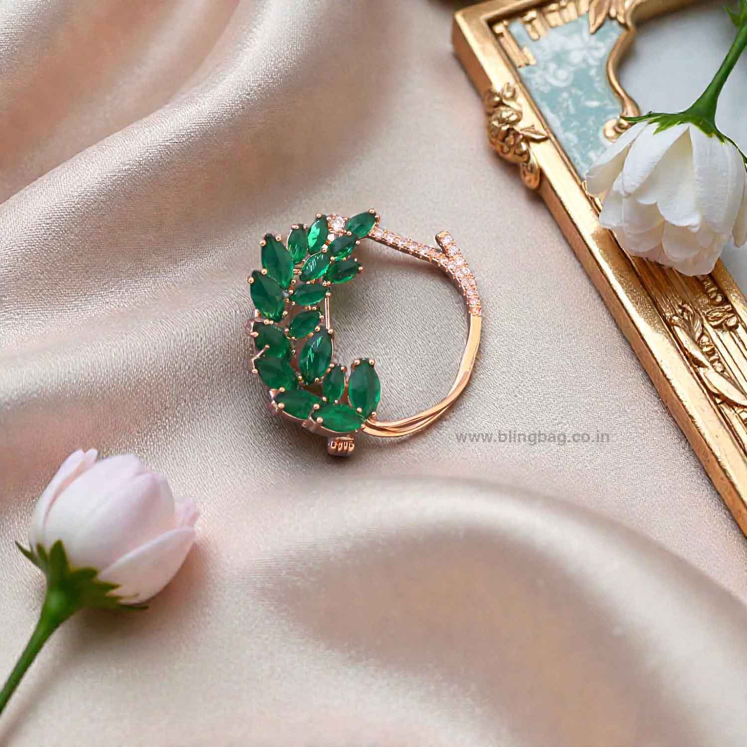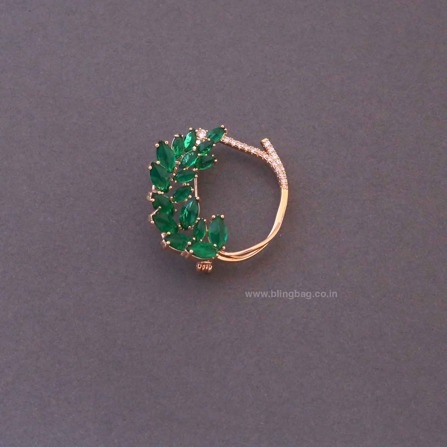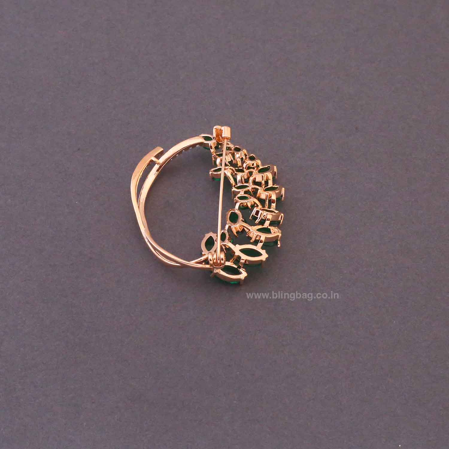 This elegant accessory showcases a circular wreath design blooming with an array of marquise-cut gems. The piece is highlighted by a delicate branch motif adorned with shimmering pavé-set accents for a nature-inspired aesthetic. Its diverse gem arrangement and polished metallic frame offer a rich, textured appearance with high-fashion appeal.