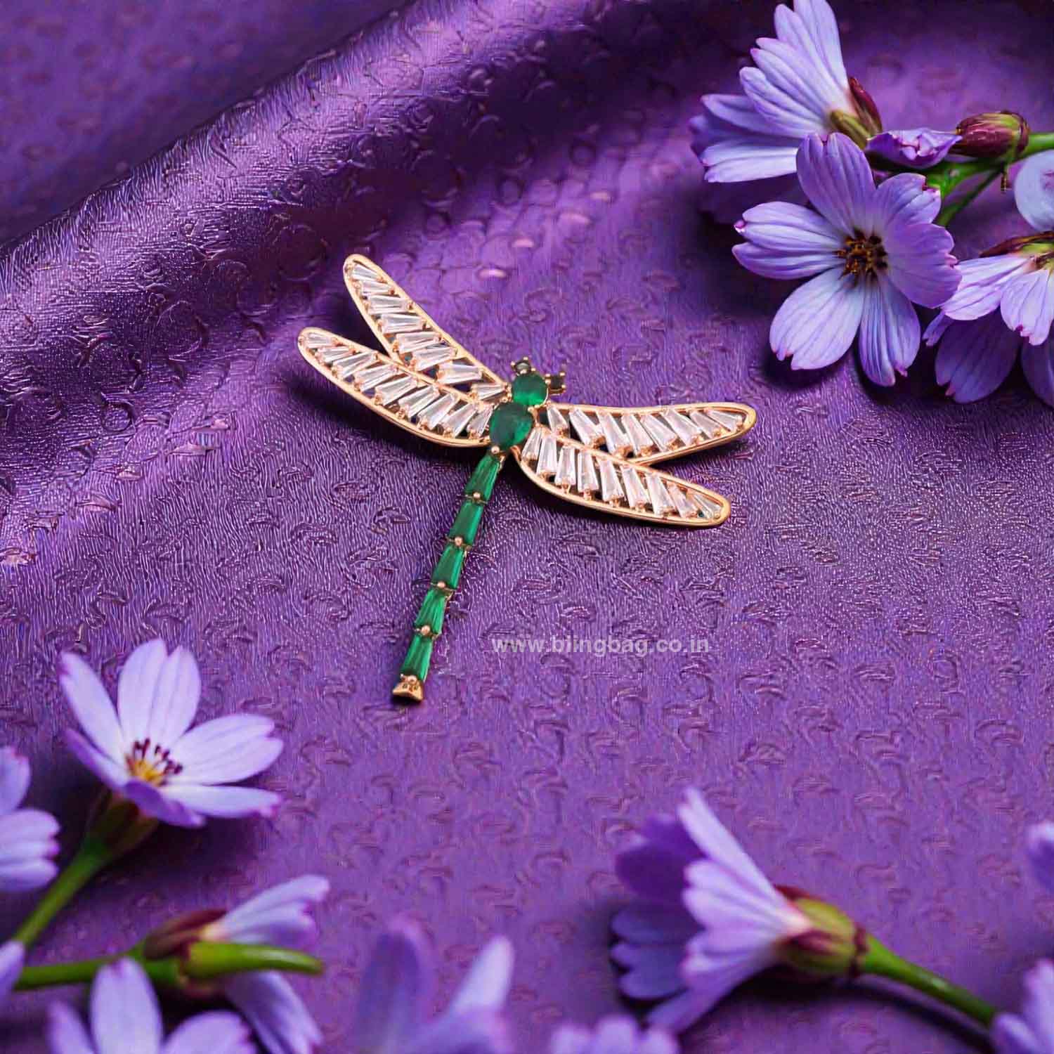 This stylish brooch is crafted in a graceful dragonfly design, featuring sleek baguette-cut stones on the wings and a striking row of deep-toned stones forming the body. The clean lines and detailed structure give it a modern yet elegant appeal.