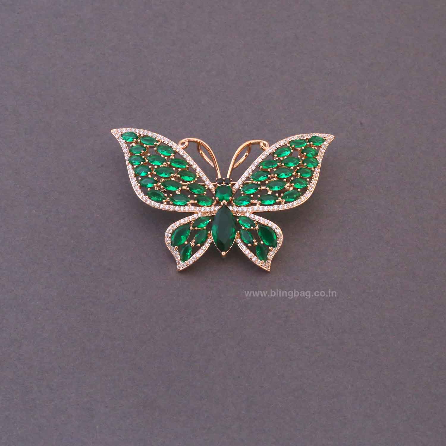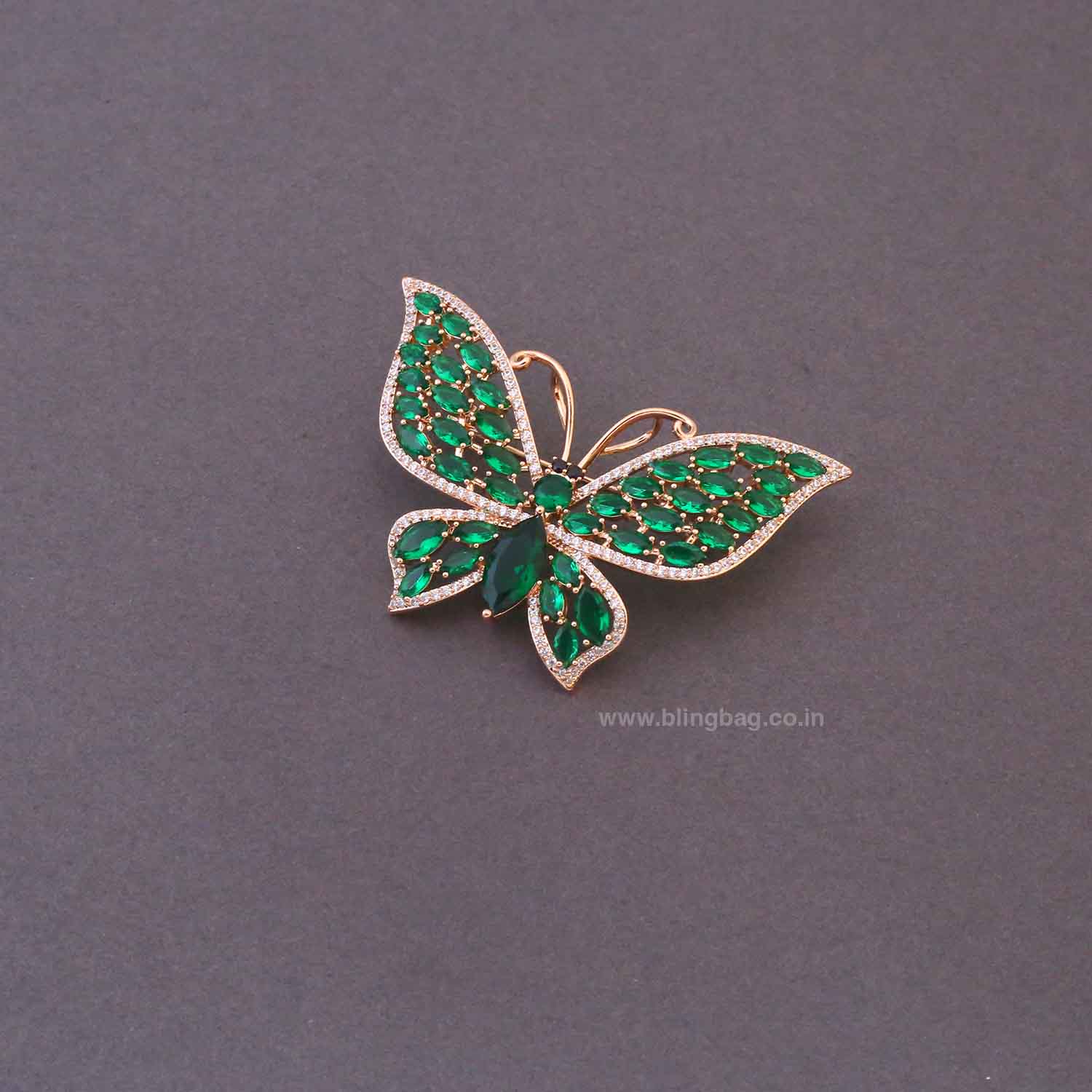 This elegant brooch features a graceful butterfly motif encrusted with brilliant marquise-cut gems and shimmering accents. The intricate open-work wings and polished metal finish highlight the premium craftsmanship and artistic detail. Its symmetrical design provides a refined and sophisticated look for any occasion.