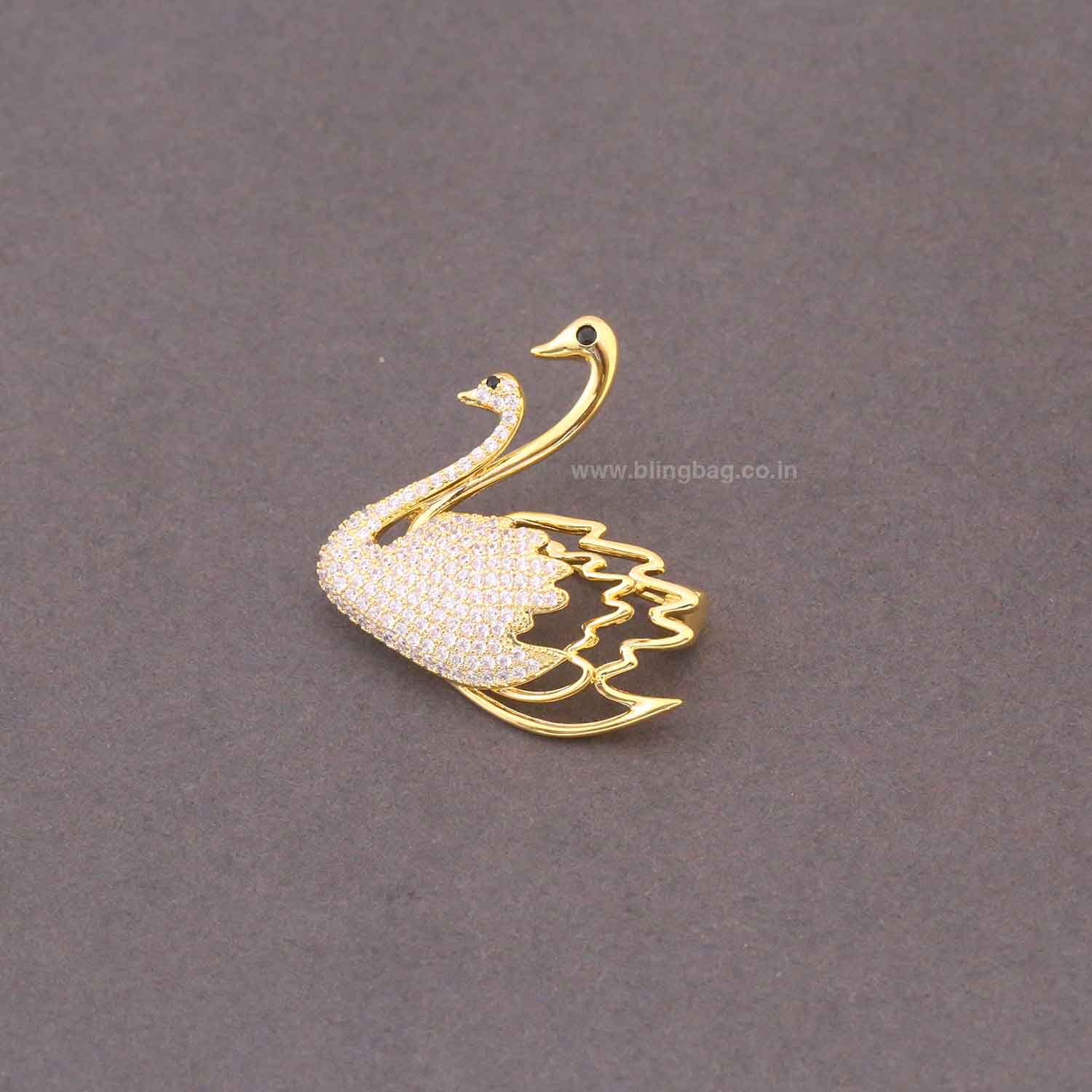 This elegant swan-inspired brooch features a graceful twin-swan design adorned with shimmering crystals and a rich gold-tone finish. Its refined curves and sparkling surface create a timeless, luxurious accessory.