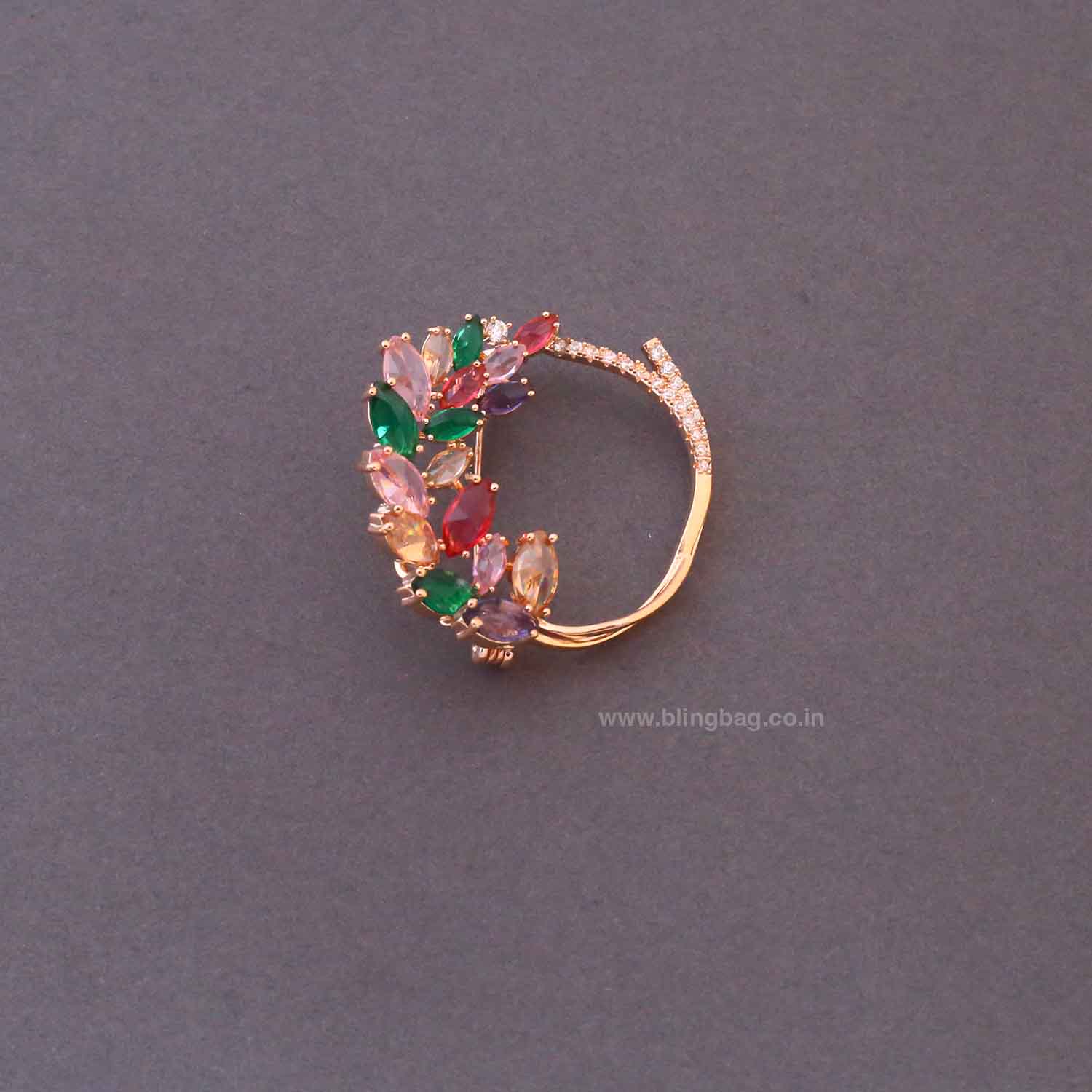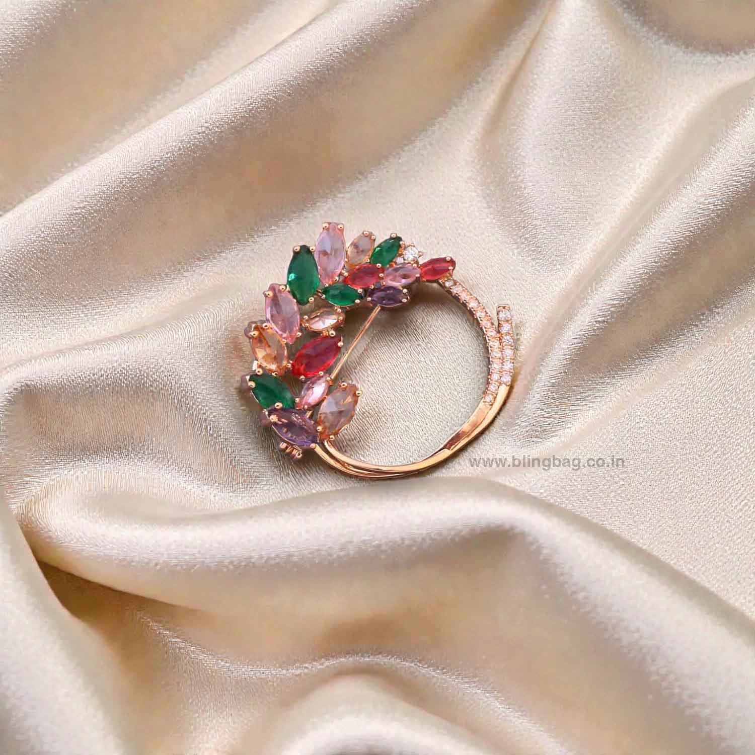This elegant accessory showcases a circular wreath design blooming with an array of marquise-cut gems. The piece is highlighted by a delicate branch motif adorned with shimmering pavé-set accents for a nature-inspired aesthetic. Its diverse gem arrangement and polished metallic frame offer a rich, textured appearance with high-fashion appeal.