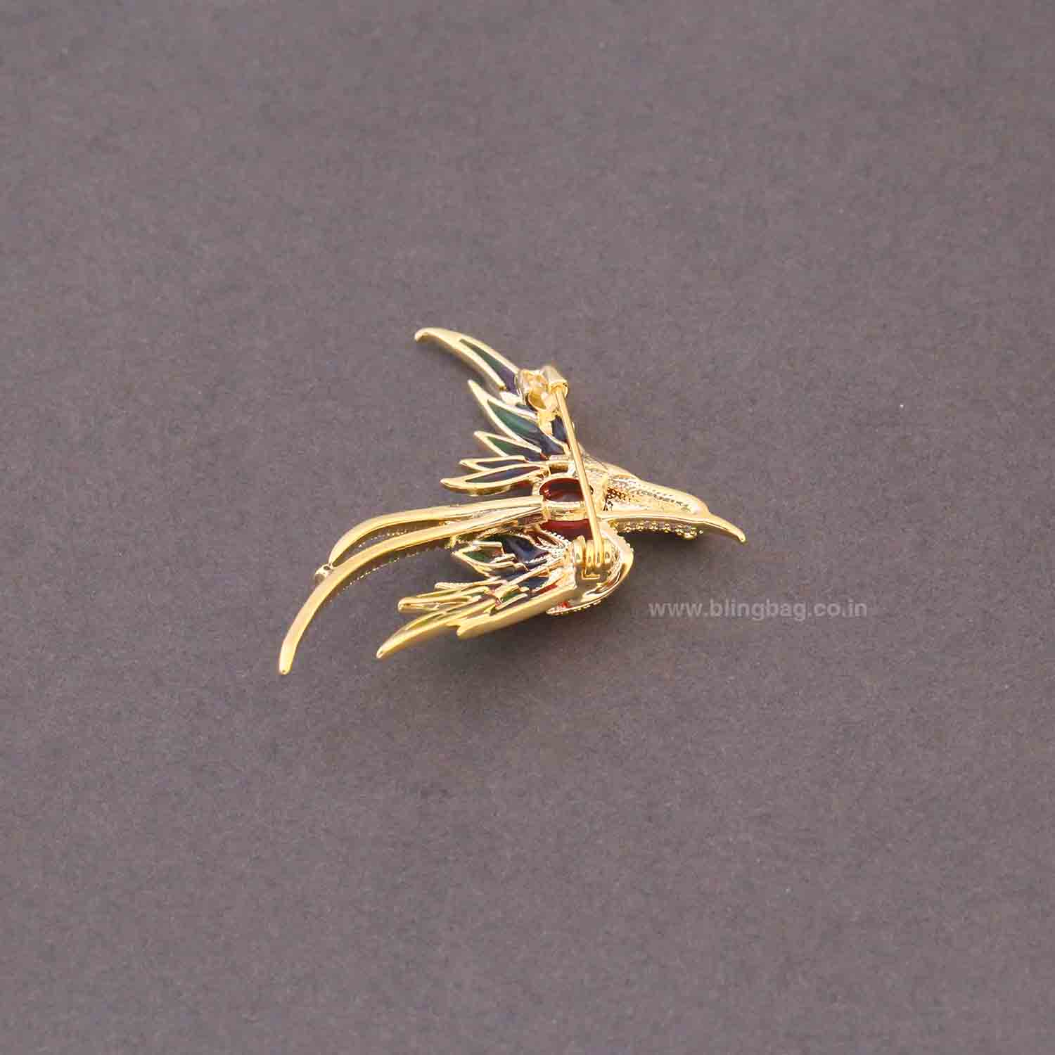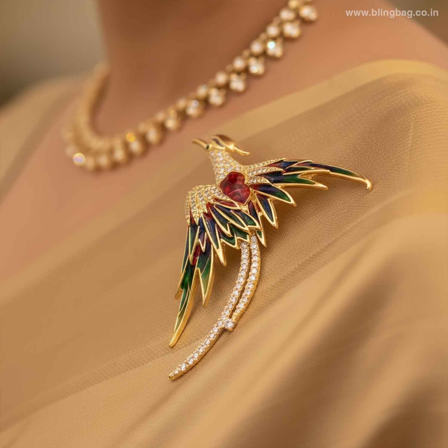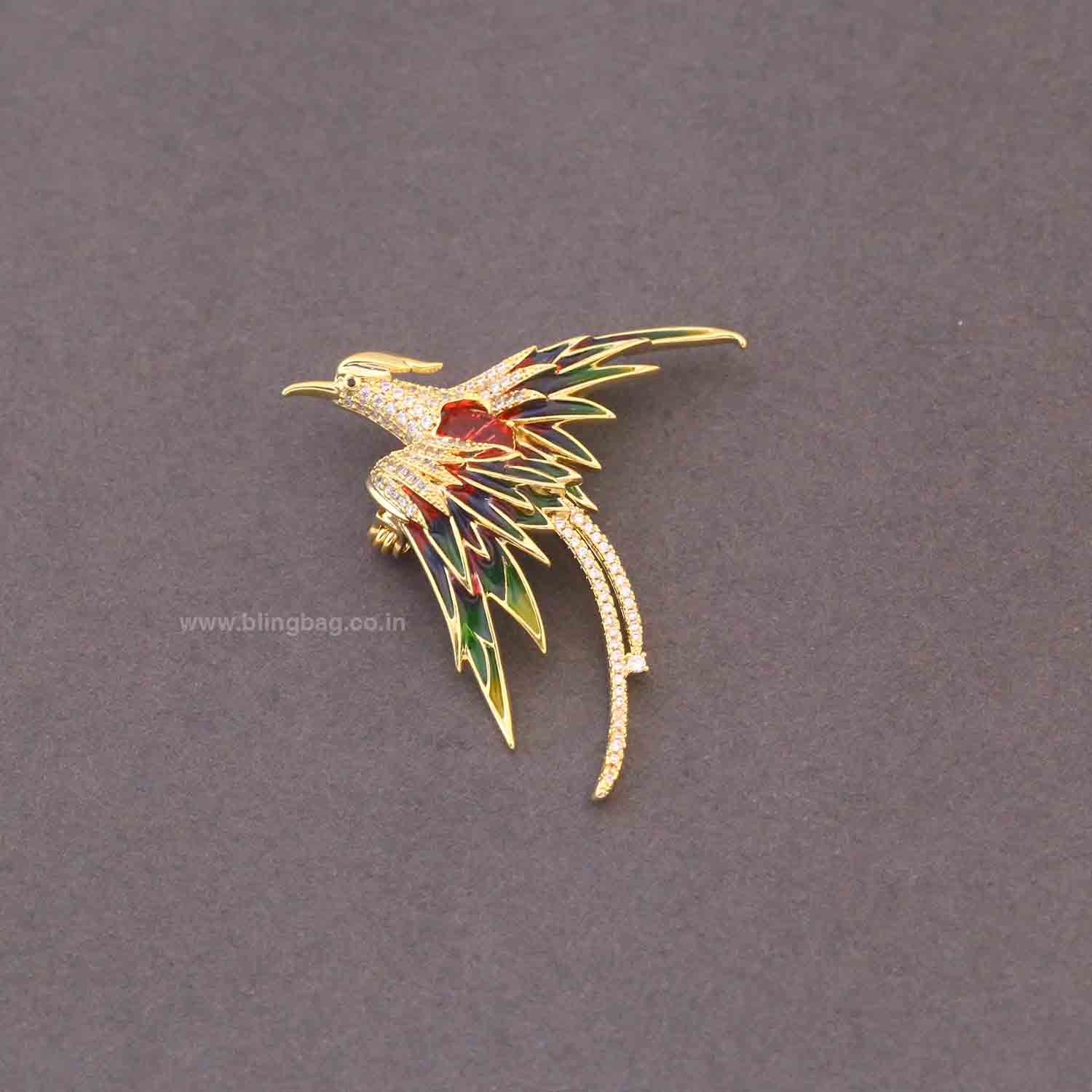 This elegant phoenix-inspired brooch features a beautifully detailed bird design with shimmering stones and fine enamel work. Its graceful wings and curved tail create a luxurious and eye-catching look, perfect for adding charm to any outfit.