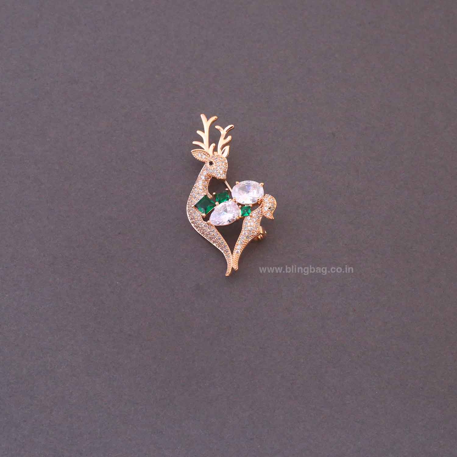 This stylish brooch showcases a graceful deer motif with a sleek, artistic silhouette. The design is highlighted with neatly set stones along the body and antlers, complemented by leaf-shaped accents that add depth and elegance. The refined detailing gives it a distinctive and premium look.