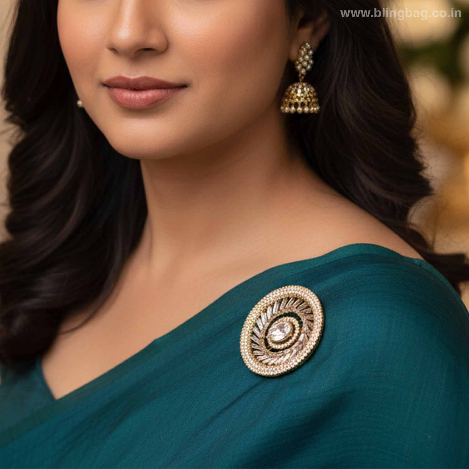 Pin this brooch to the shoulder of a solid teal or forest green saree to act as a sophisticated focal point against deep, saturated colors.