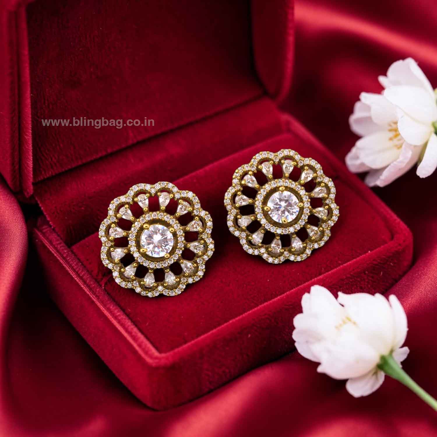 Graceful floral stud earrings designed with sparkling zirconia stones arranged in an elegant layered pattern. The intricate detailing and radiant center stone create a timeless and sophisticated appeal.