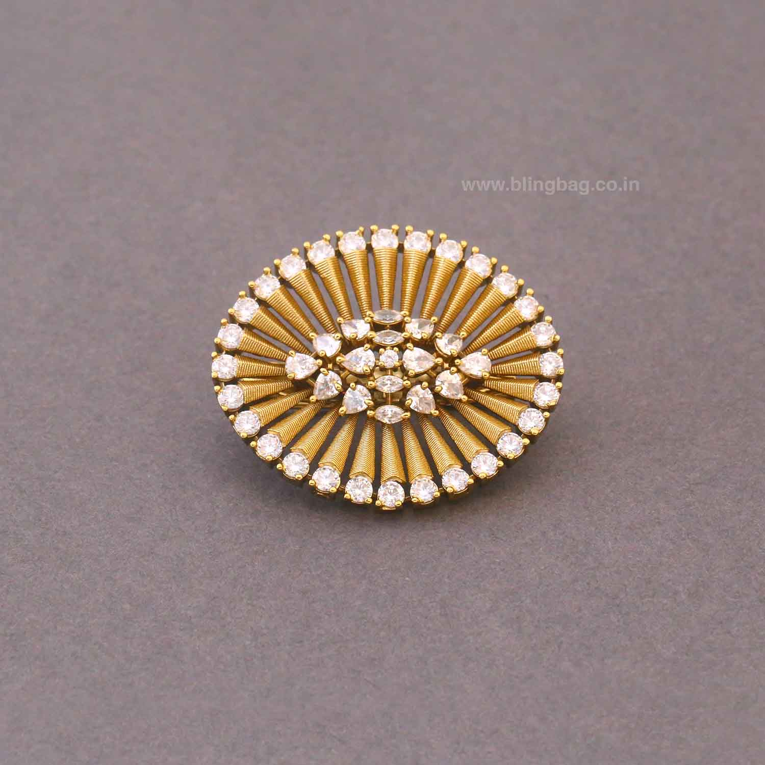 Command attention with the Golden Tarish Brooch, a striking piece that captures the powerful energy of a sunburst. Designed with precision and a bold architectural flair, it is the perfect statement accessory for those who want their elegance to shine bright.