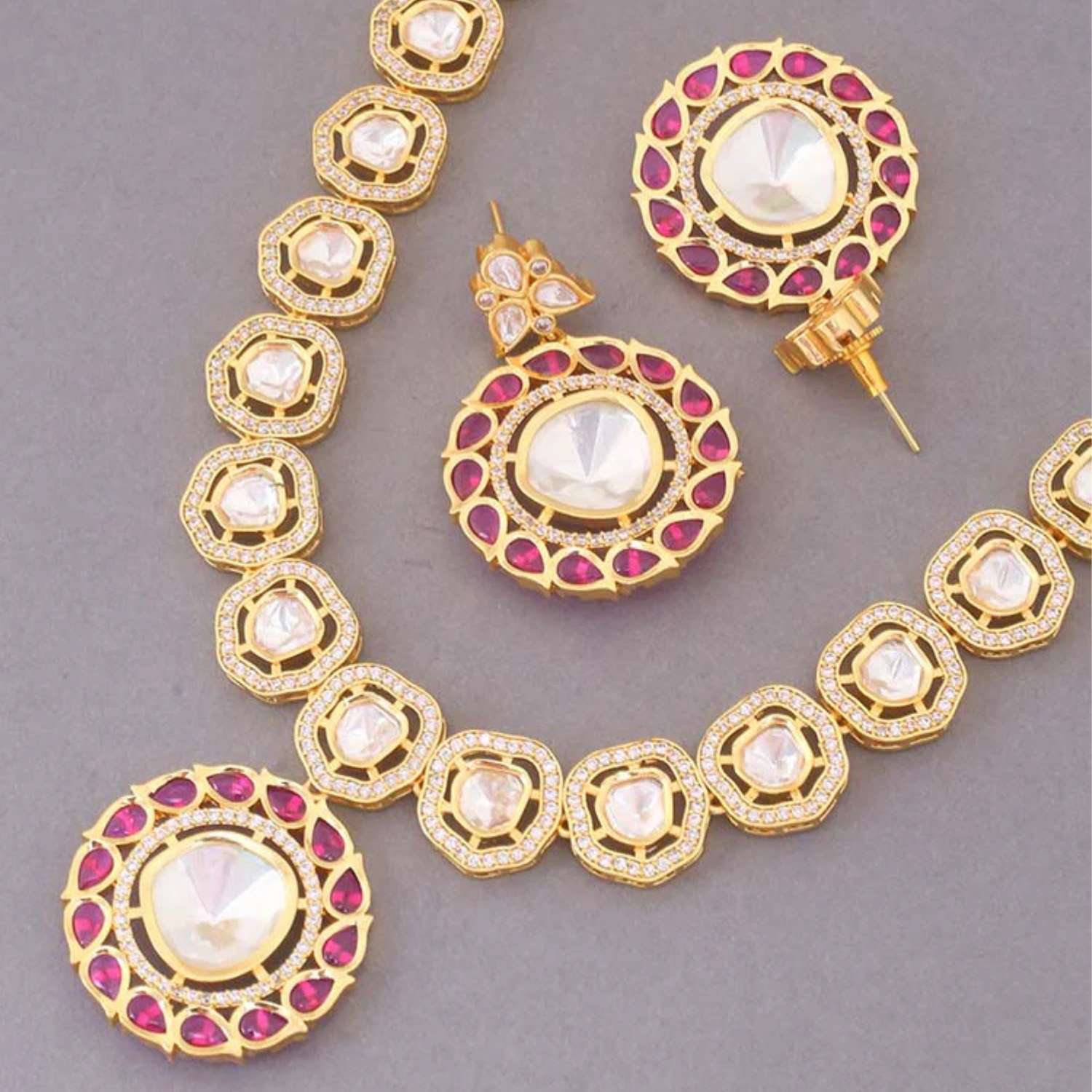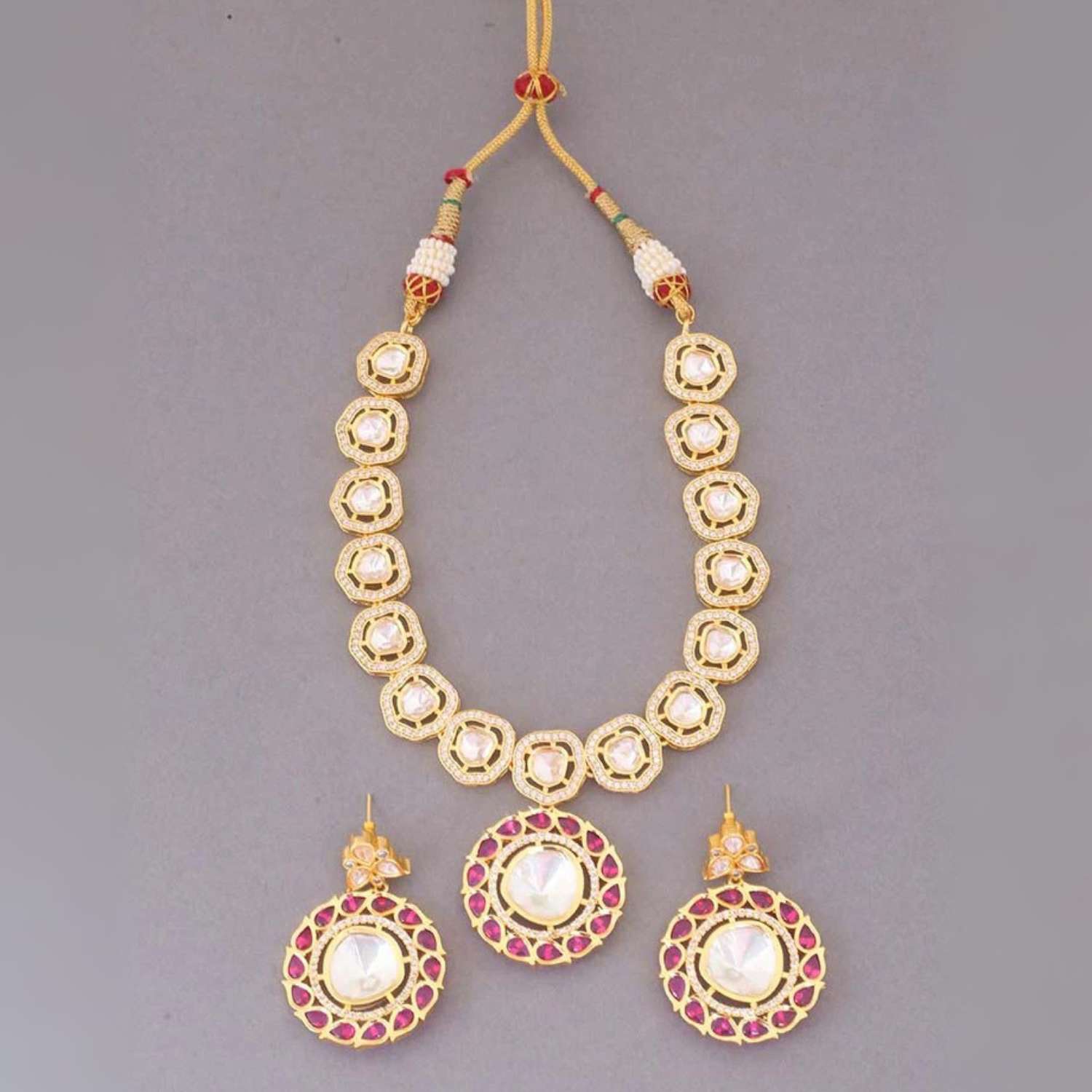 This necklace is the ultimate accessory option for the festive season. This set has a gorgeous circular floral pattern. The necklace has vibrant pearl detailing all over. The set also has a bright element of Kundan detailing in its structure. So, don't miss out on this gorgeous necklace set this eventful season as you have ramps to walk ahead.