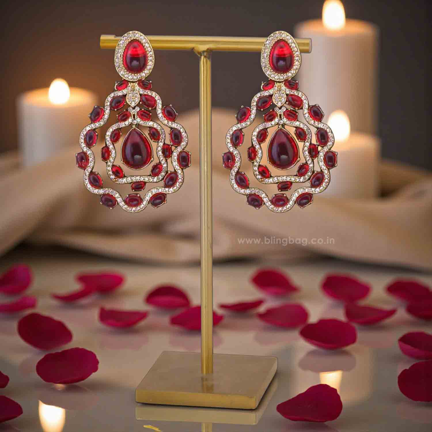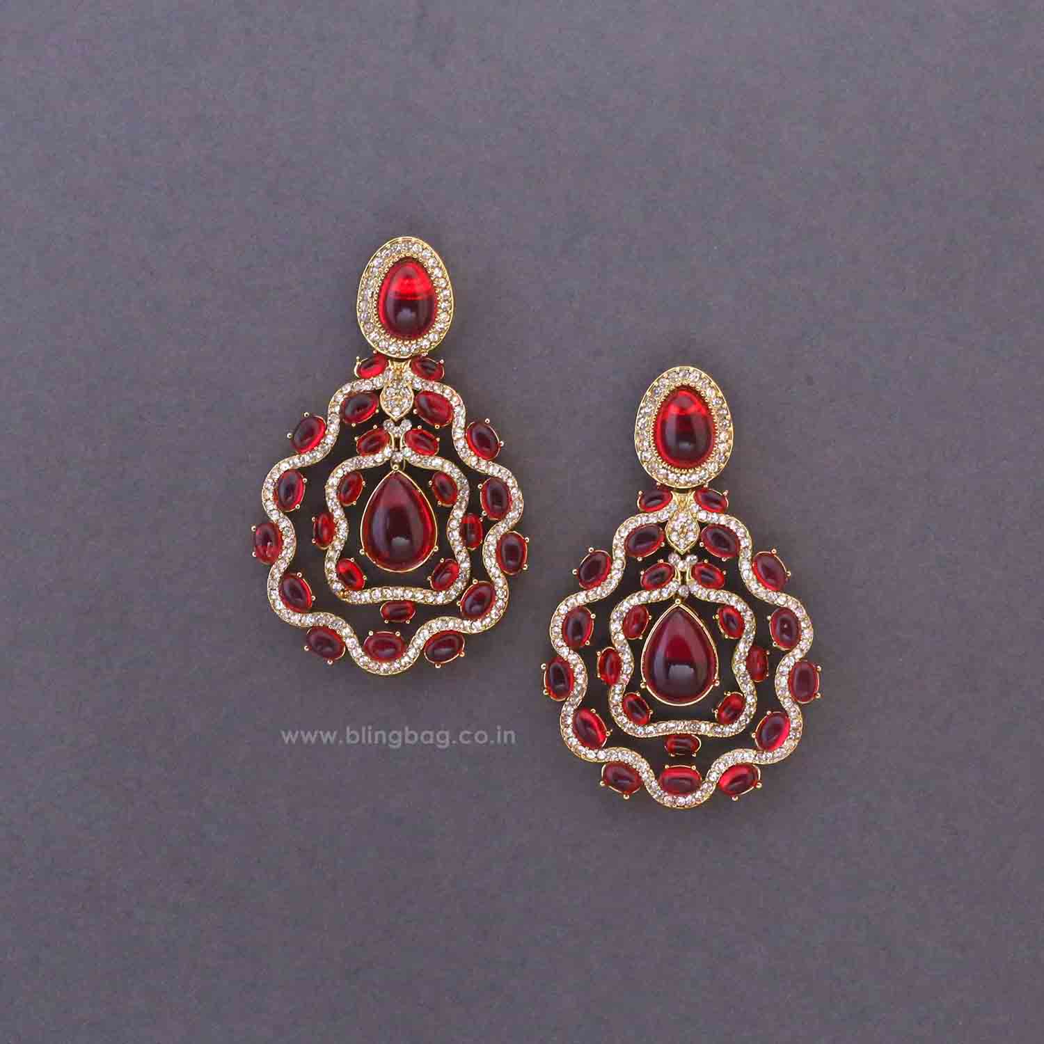 These elegant drop earrings feature a graceful layered design highlighted with soft-toned stones and fine crystal detailing. The structured silhouette with a central teardrop accent creates a refined statement look that feels festive and sophisticated.