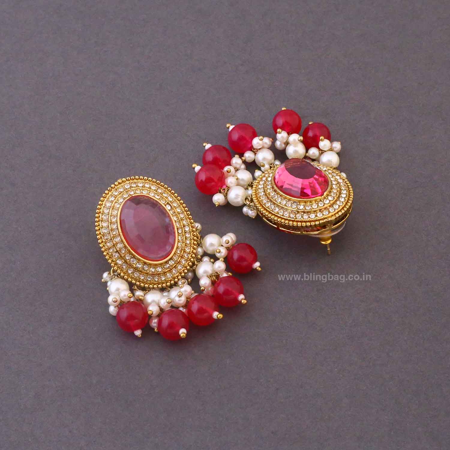 Graceful dangler earrings adorned with intricate kundan work and layered stone detailing, finished with delicate pearl drops for a royal appeal. A timeless statement piece that beautifully reflects traditional elegance.