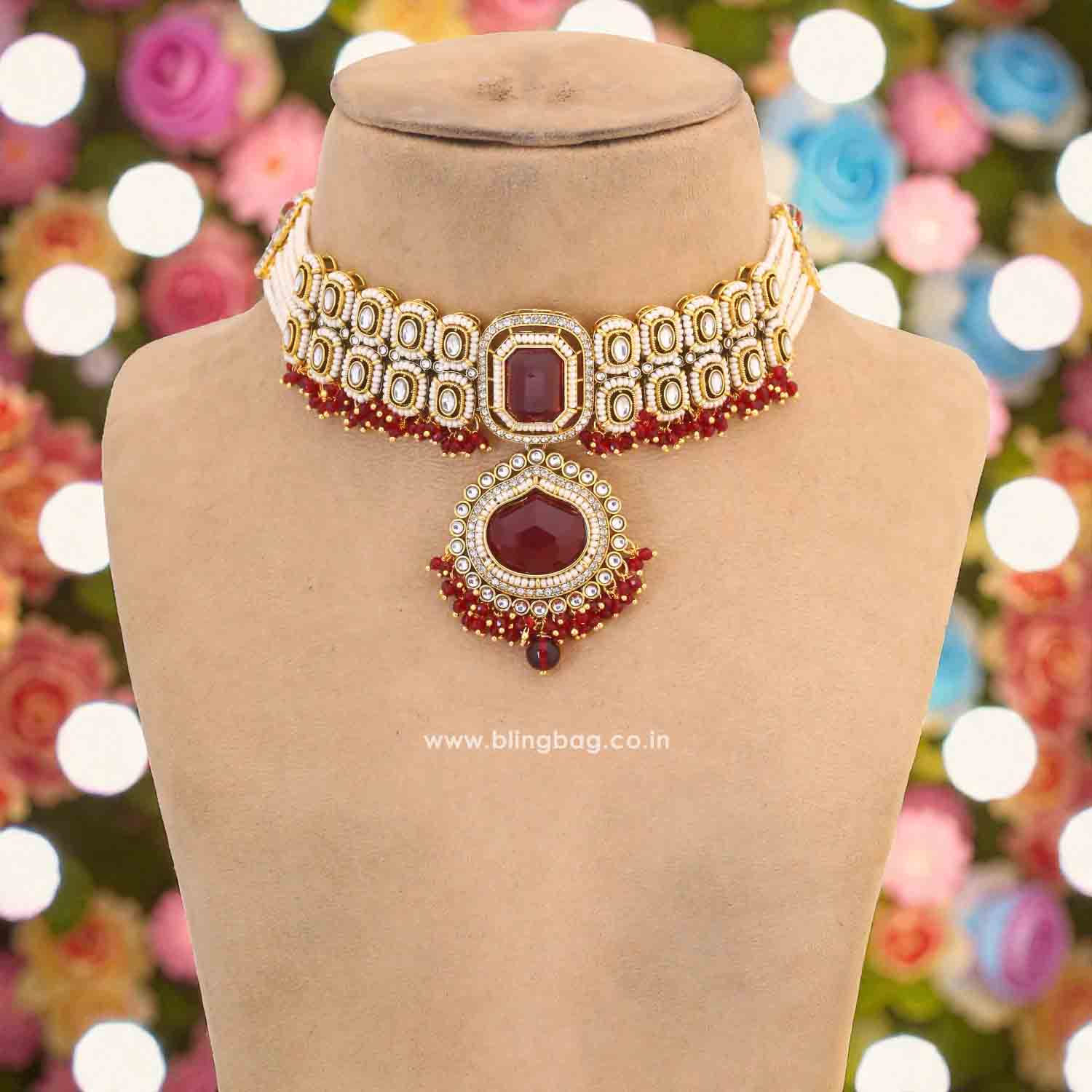 This necklace is the ultimate accessory option for the festive season. This set has a gorgeous circular floral pattern. The necklace has vibrant pearl detailing all over. The set also has a bright element of Kundan detailing in its structure. So, don't miss out on this gorgeous necklace set this eventful season as you have ramps to walk ahead.