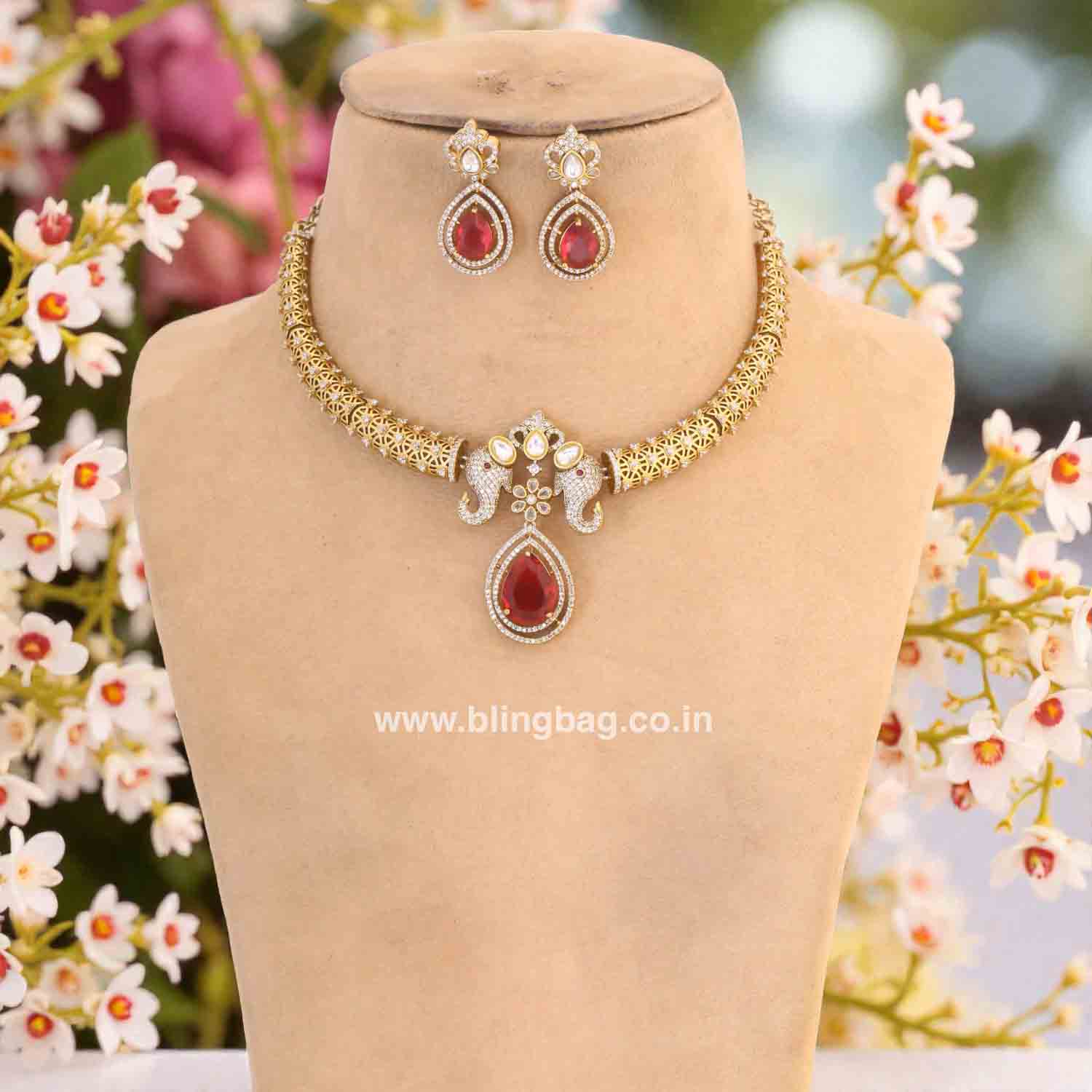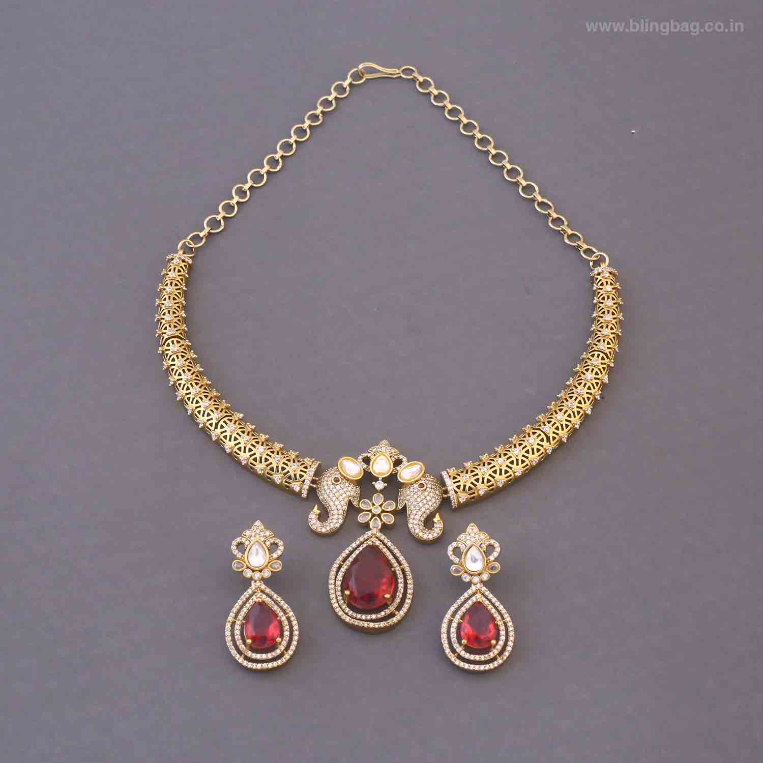 Embrace global style with this opulent Victorian Jewellery Set! Featuring a handcrafted gold-toned collar necklace and matching teardrop earrings, this set adds a touch of royal cultural flair to your ensemble. The centerpiece showcases twin elephant motifs—symbols of strength and wisdom—adorned with shimmering stones and a brilliant, oversized pear-cut crystal. The intricate "jaali" (lattice) work on the necklace band creates a rich, textured finish that reflects a heritage of fine craftsmanship.