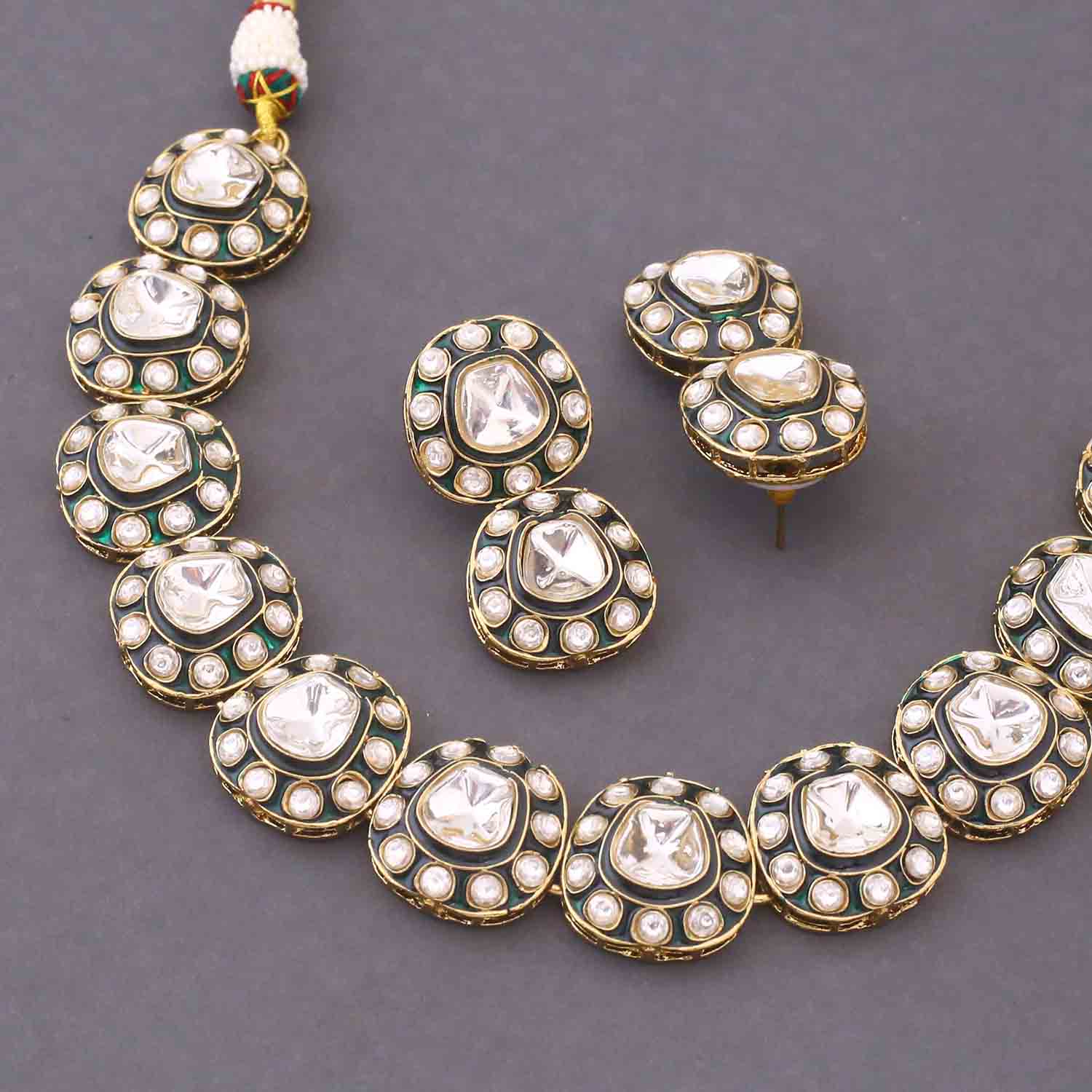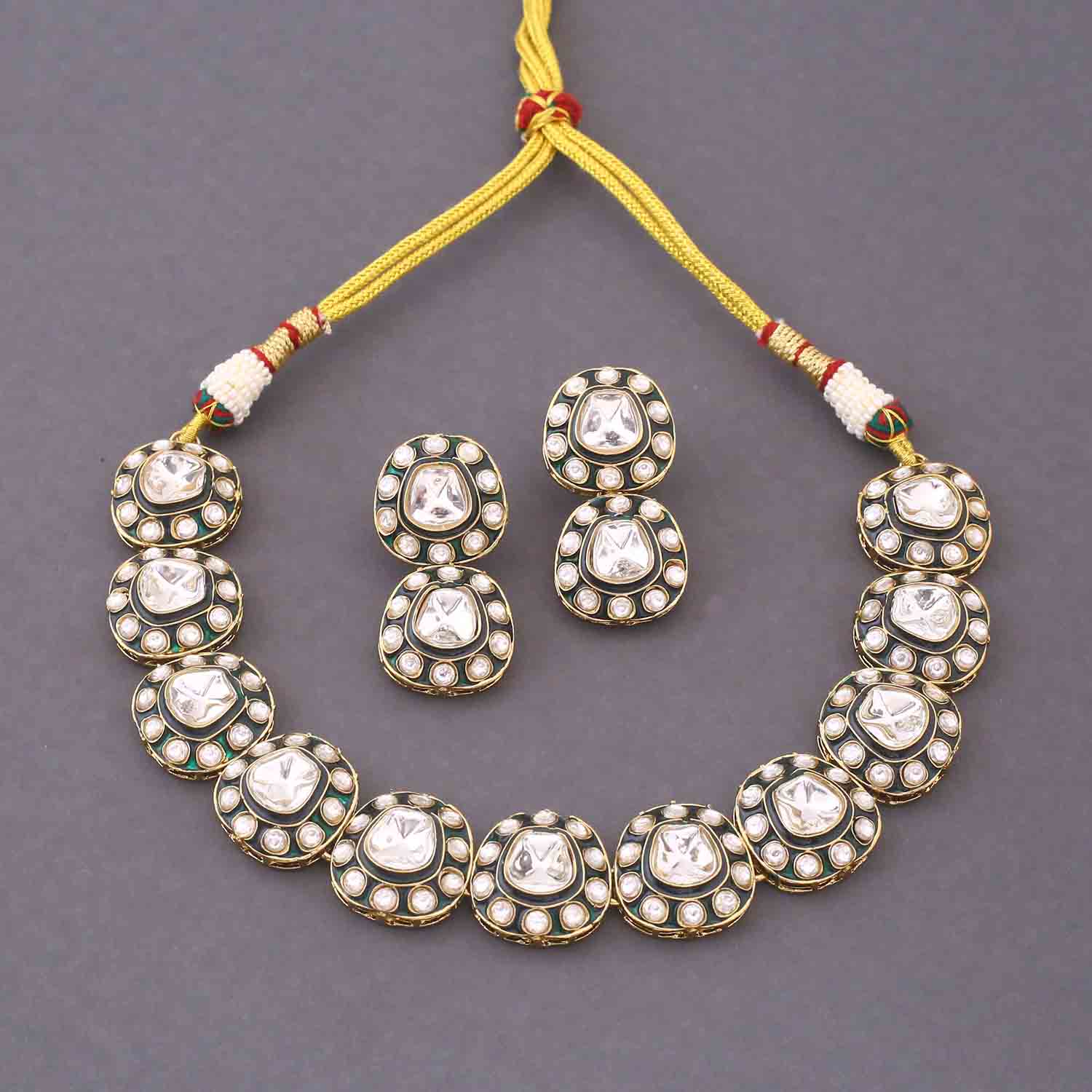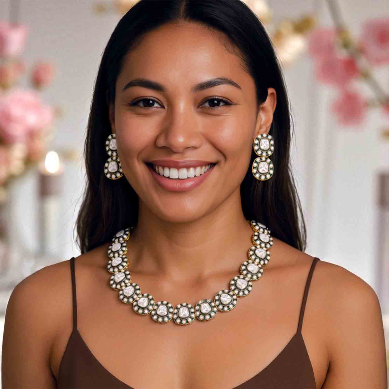 This necklace is the ultimate accessory option for the festive season. This set has a gorgeous circular floral pattern. The necklace has vibrant pearl detailing all over. The set also has a bright element of Kundan detailing in its structure. So, don't miss out on this gorgeous necklace set this eventful season as you have ramps to walk ahead.
