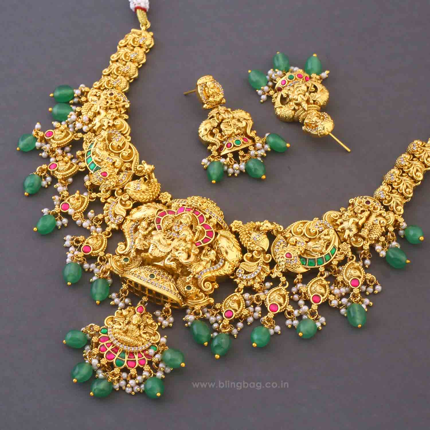The temple necklace set epitomizes the grandeur and spiritual essence of Indian heritage, blending divine motifs with exquisite craftsmanship. Crafted with precision, each piece in the set showcases a harmonious blend of tradition and elegance.