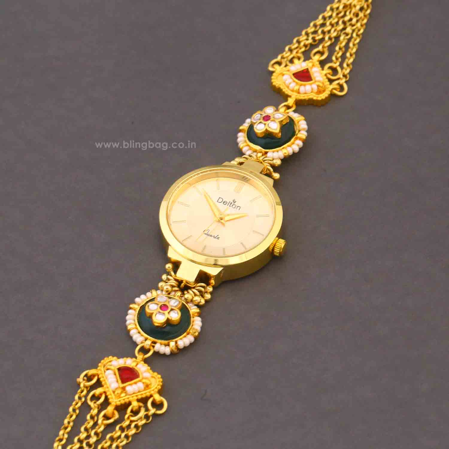 Introducing the Golden Enchant Zenia Watch by Blingbag, a masterpiece crafted for those who adore ethnic elegance with a touch of luxury. The watch features a radiant gold-toned dial, complemented by a beautifully detailed enamel ethnic strap adorned with rich green enamel, pearl accents, and floral motifs that add a royal festive charm.