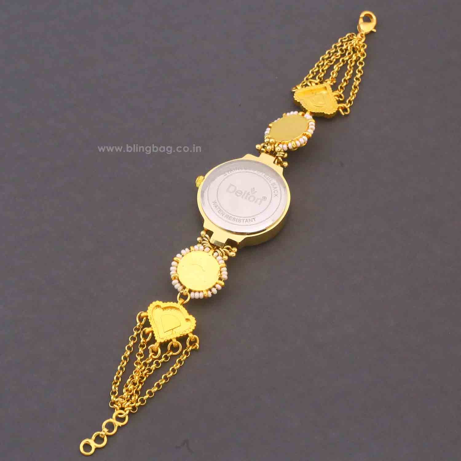 The highlight of this design is its intricate multi-chain charm drop, enhancing the traditional look while keeping it lightweight and wearable. For complete versatility, the Zenia Watch comes with an additional sleek gold metal bracelet strap, allowing you to effortlessly switch between festive ethnic glam and contemporary sophistication.