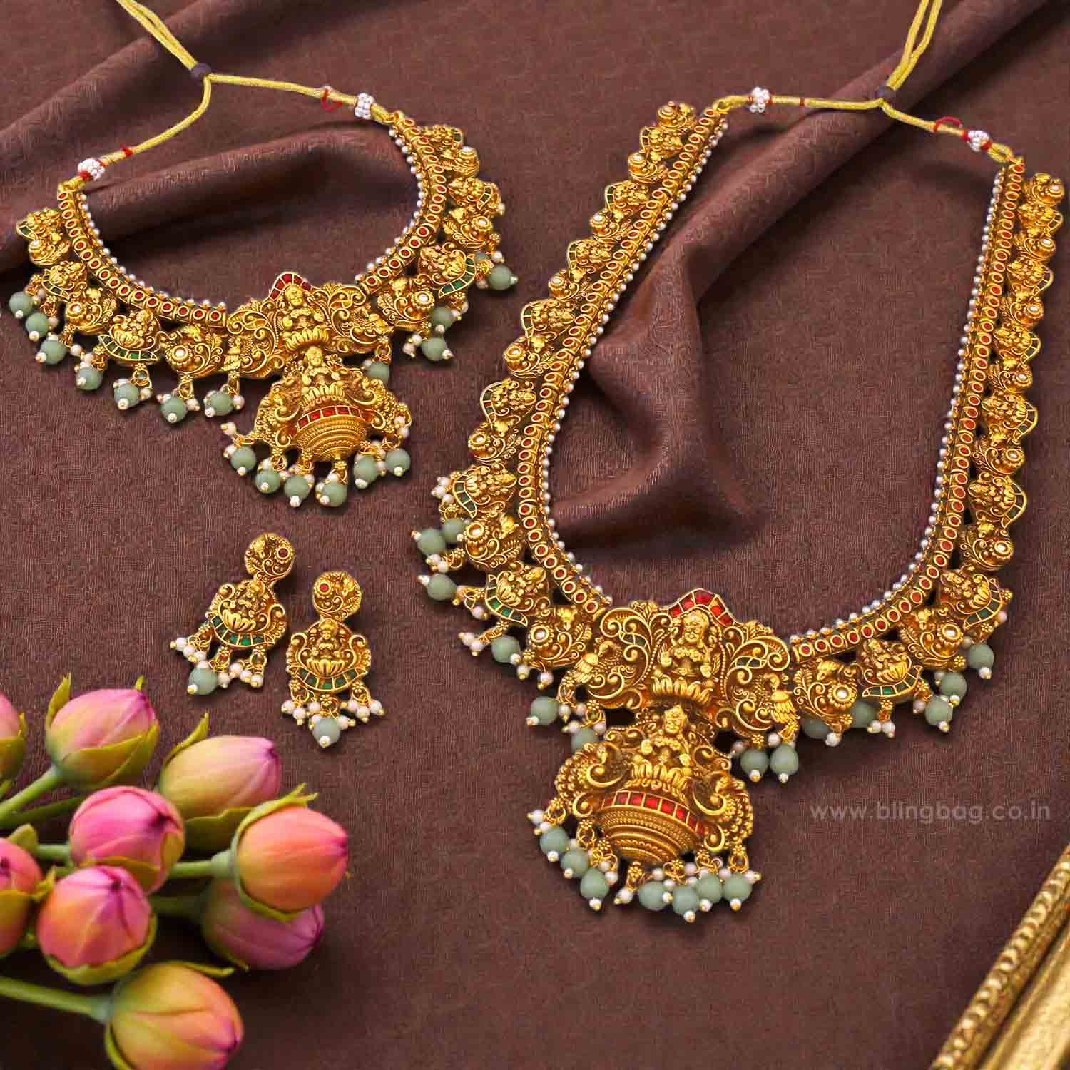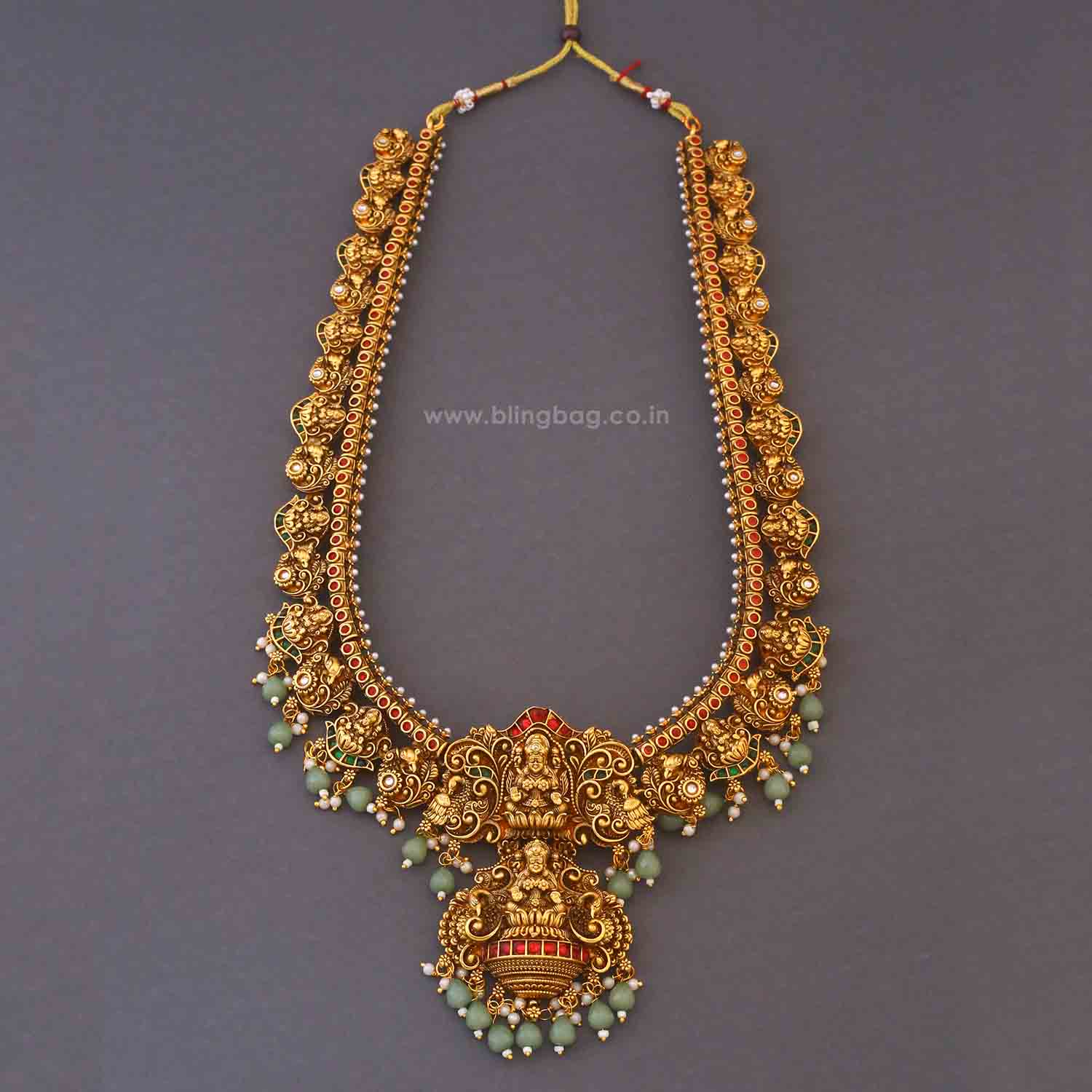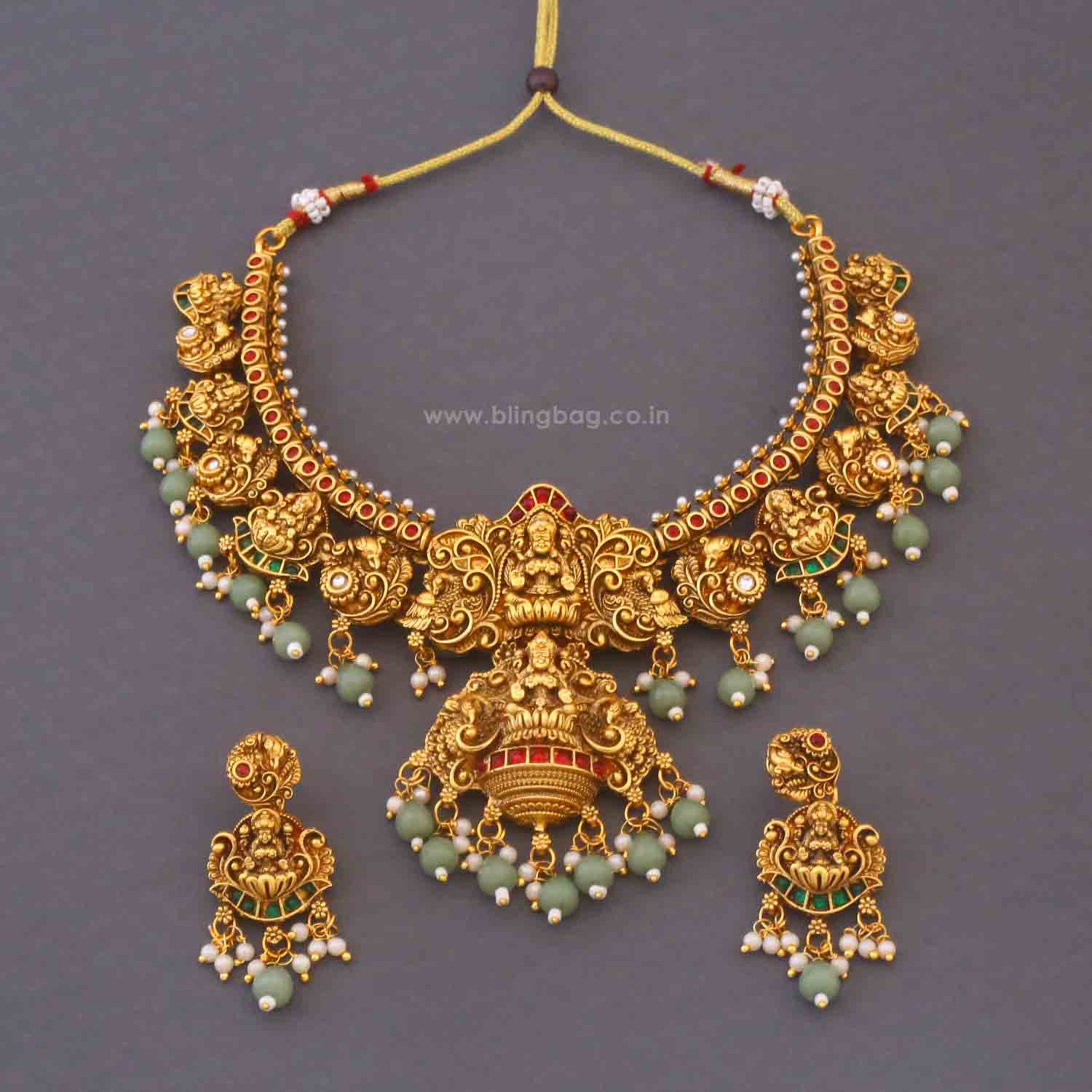 The temple necklace set epitomizes the grandeur and spiritual essence of Indian heritage, blending divine motifs with exquisite craftsmanship. Crafted with precision, each piece in the set showcases a harmonious blend of tradition and elegance.