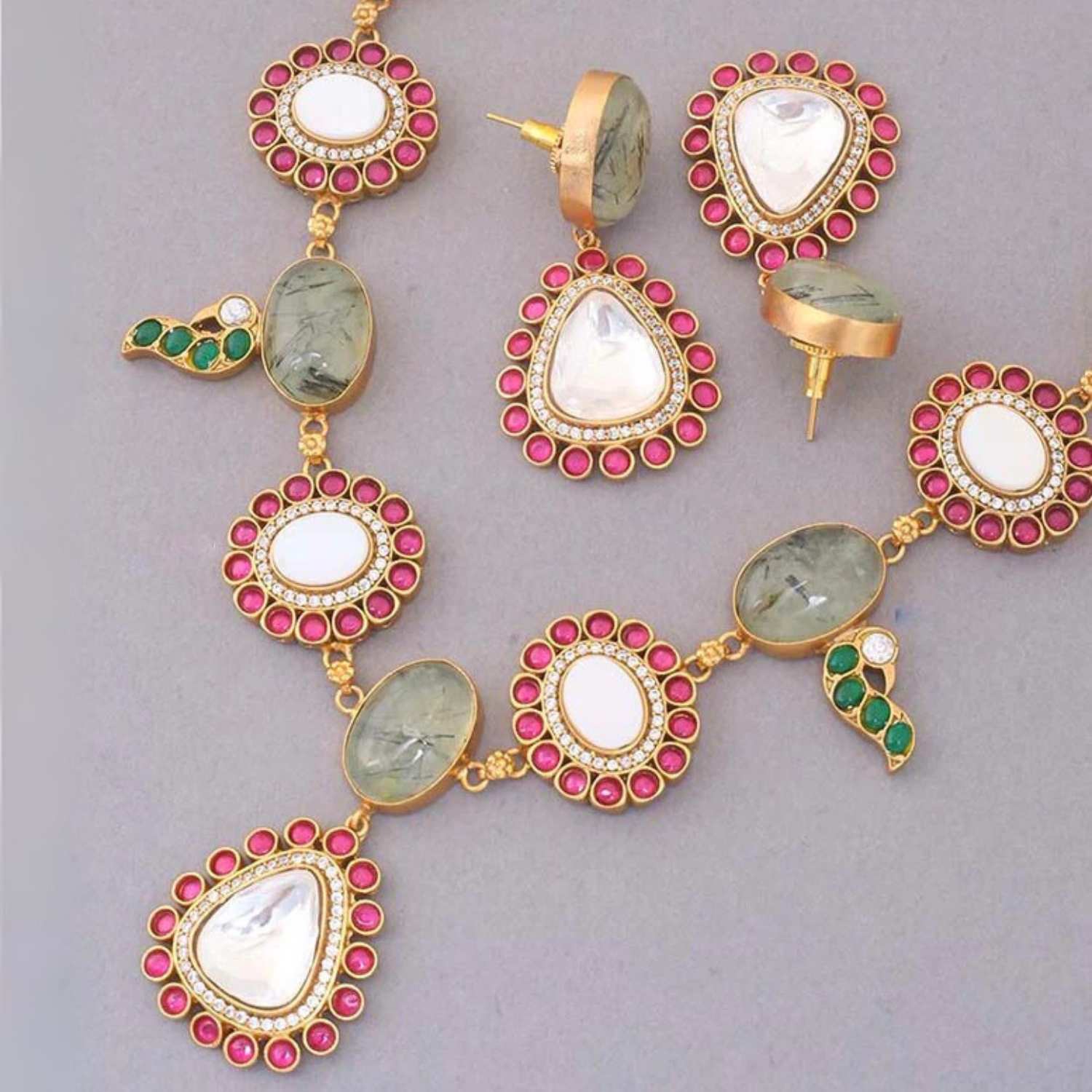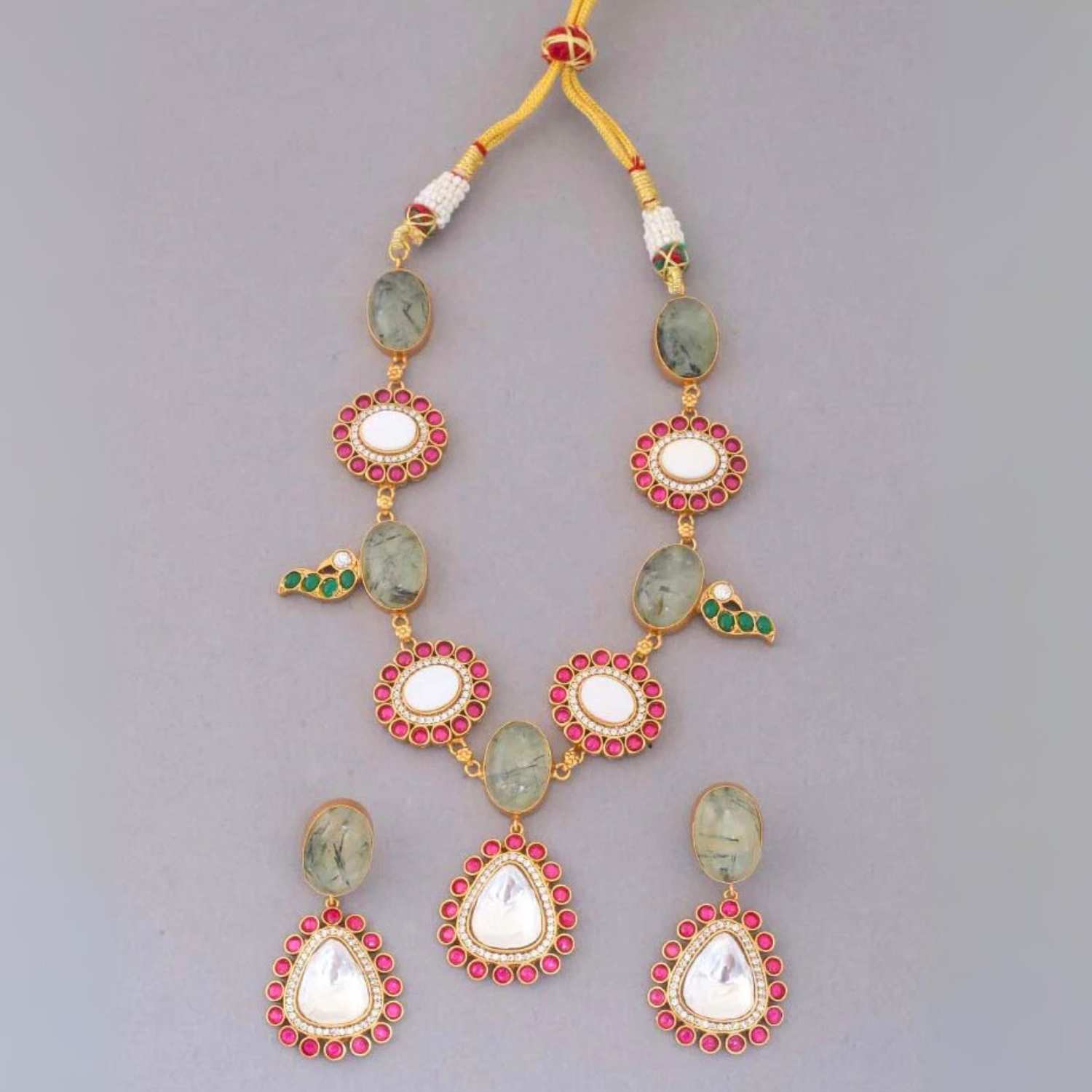 This necklace set is a combination of golden and green colour. The necklace set includes earrings, maangtikka and a necklace that will blow away every on-looker's mind with its charm and grandeur!