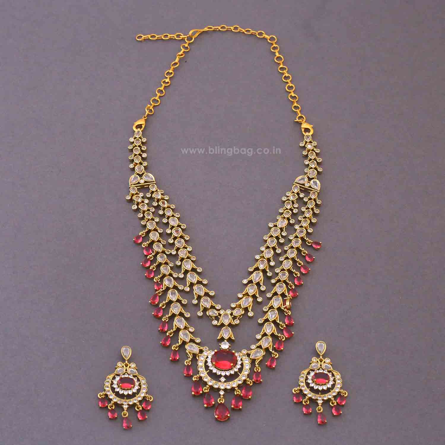 This statement jewellery set features a richly detailed layered design with shimmering stones and deep red bead drops that add movement and elegance. The intricate pattern flows beautifully, while the matching earrings mirror the same detailing to create a bold and festive look, perfect for special occasions.