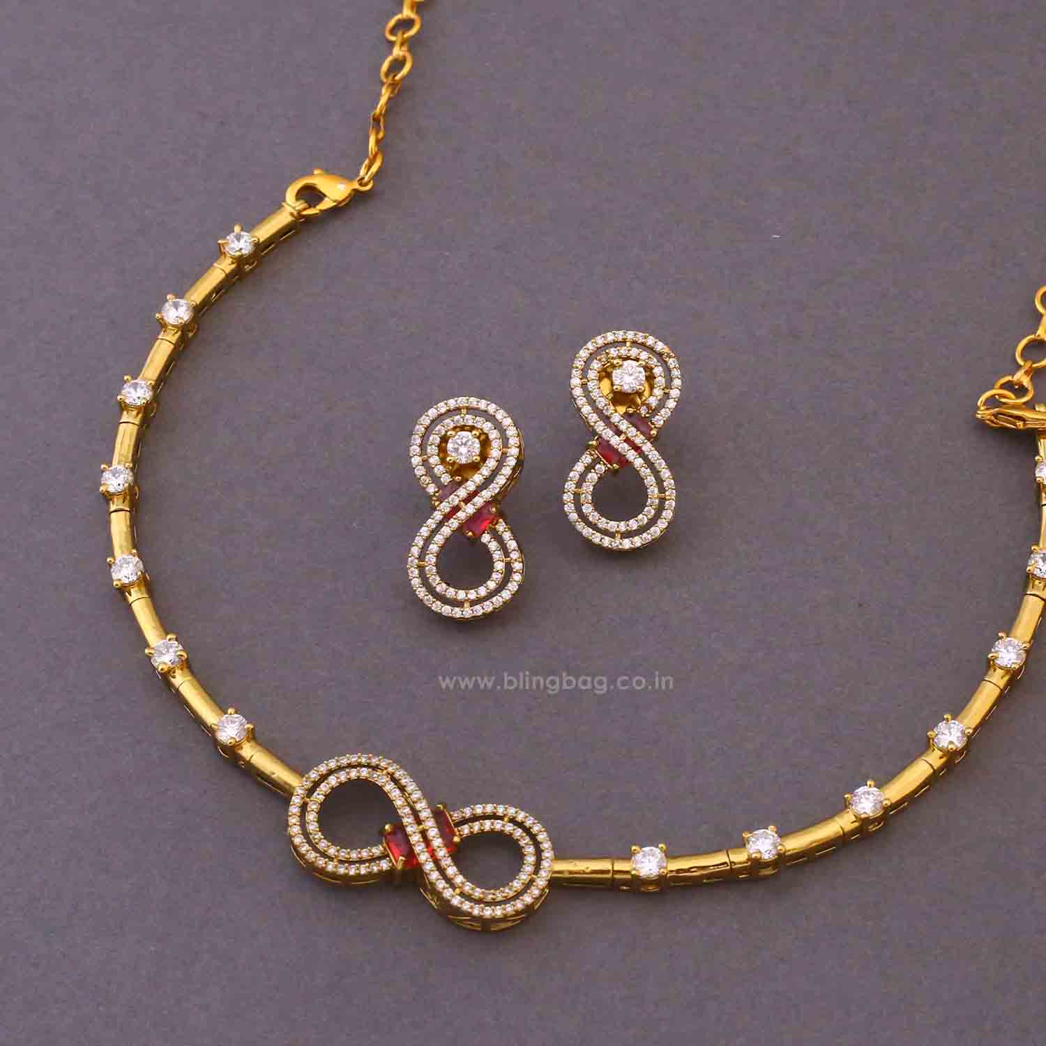 This elegant jewellery set features a sleek infinity-inspired design with fine stone detailing along a smooth curved base. The centerpiece highlights an intertwined infinity motif, while matching earrings mirror the same flowing pattern for a balanced and modern look. The overall design feels minimal yet graceful, making it suitable for refined occasions.
