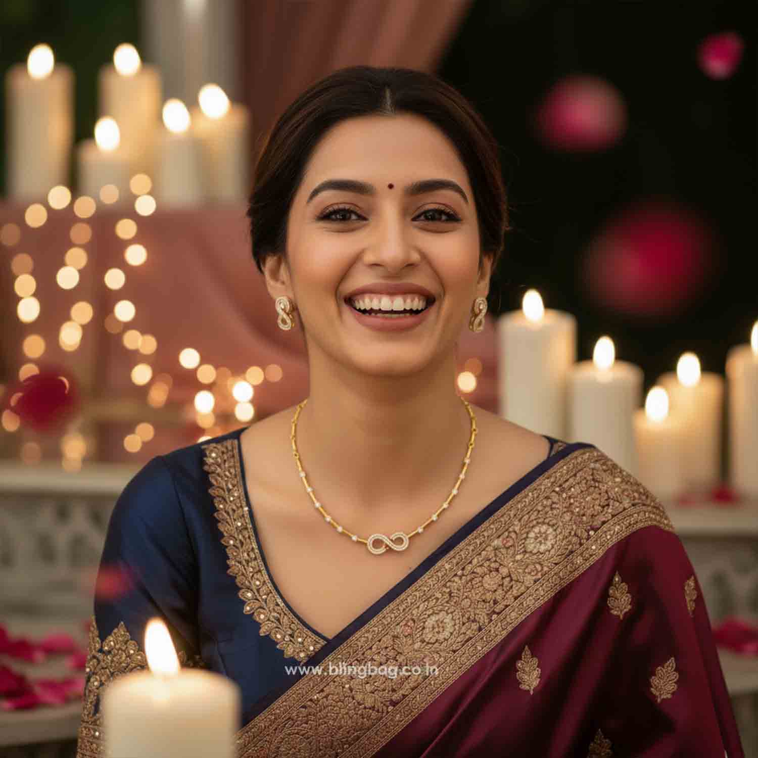 Pair this set with a solid-toned saree, gown, or contemporary ethnic outfit to highlight the infinity motif and keep the look clean, classy, and effortlessly stylish.