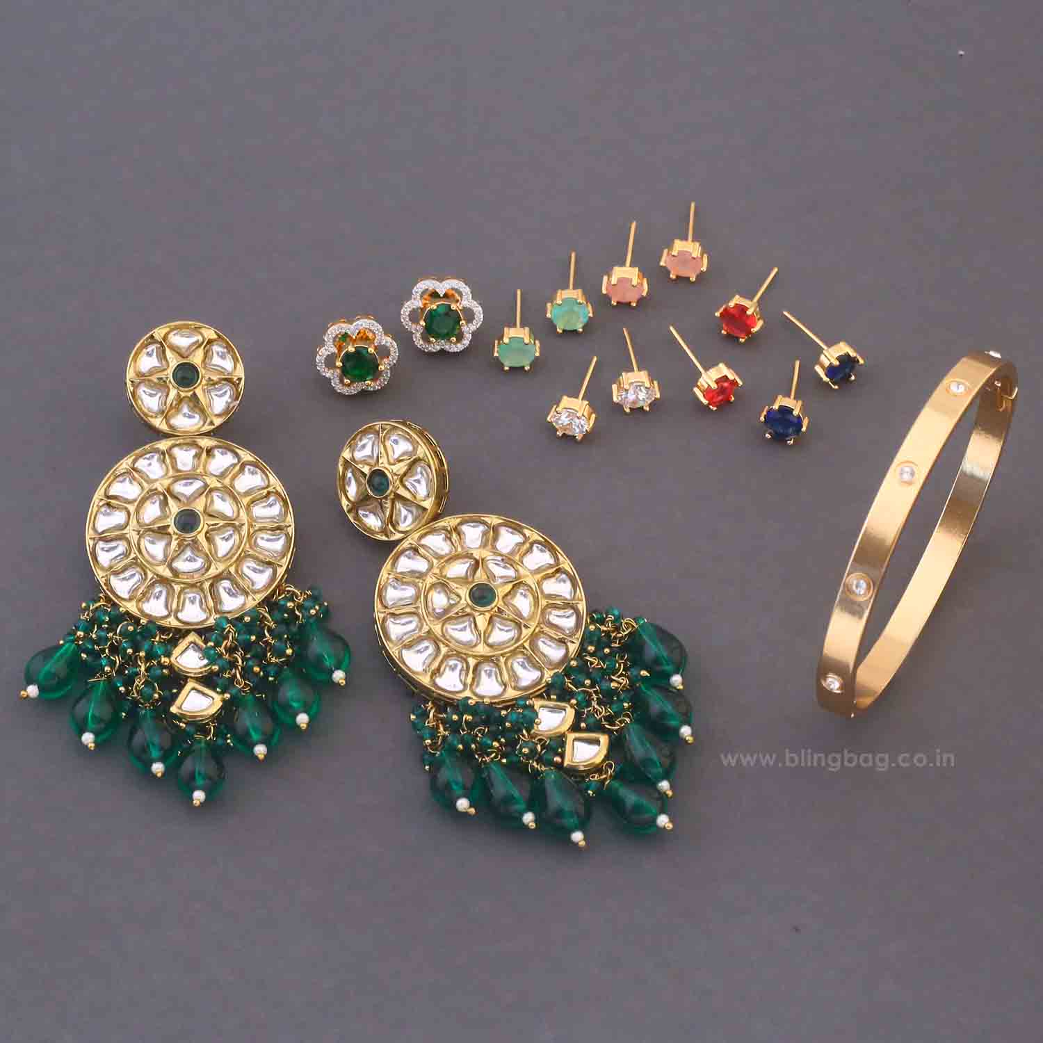 ✨ Style Tip: Pair the Kundan earrings for your mehndi or sangeet look, and switch to the colourful studs for a chic everyday sparkle.