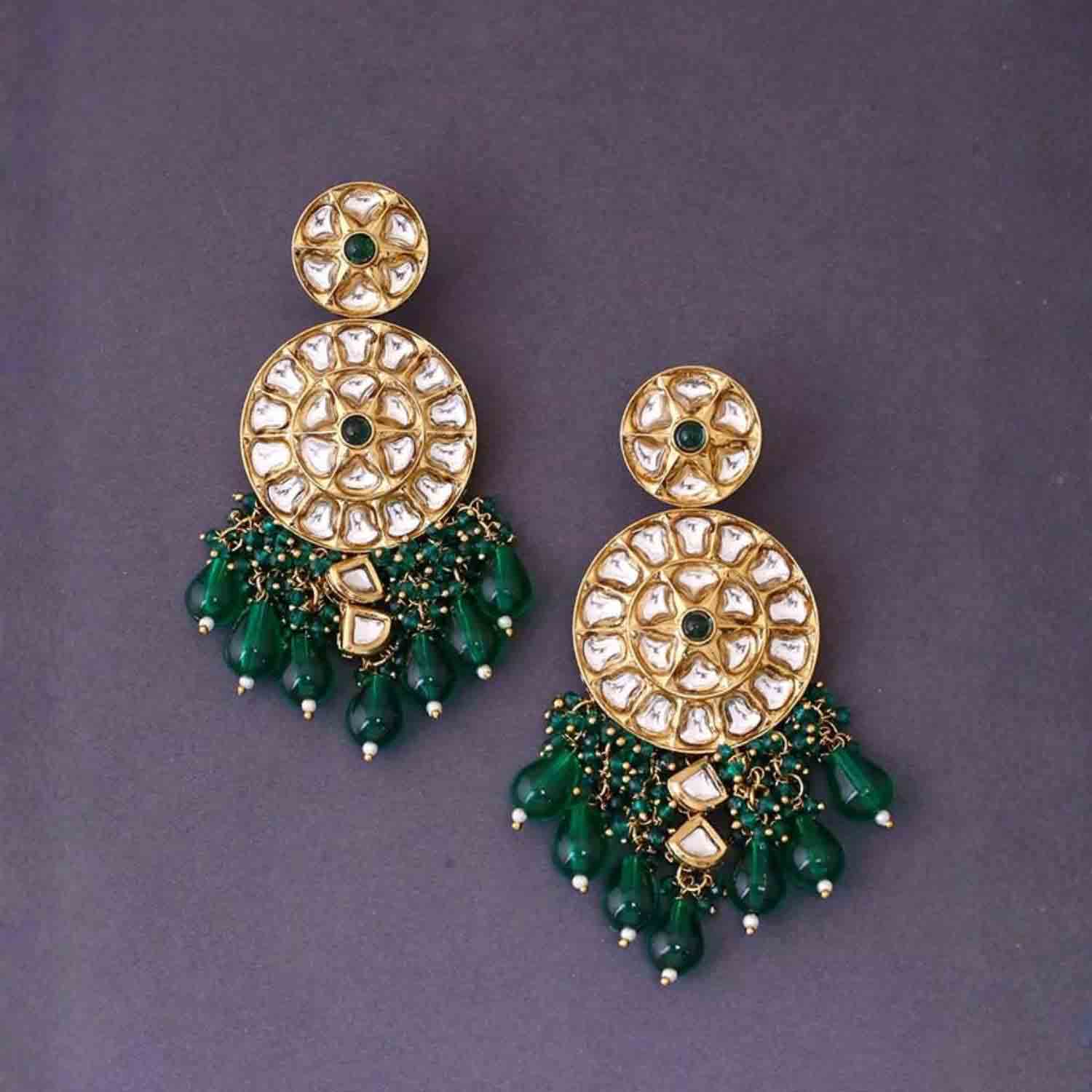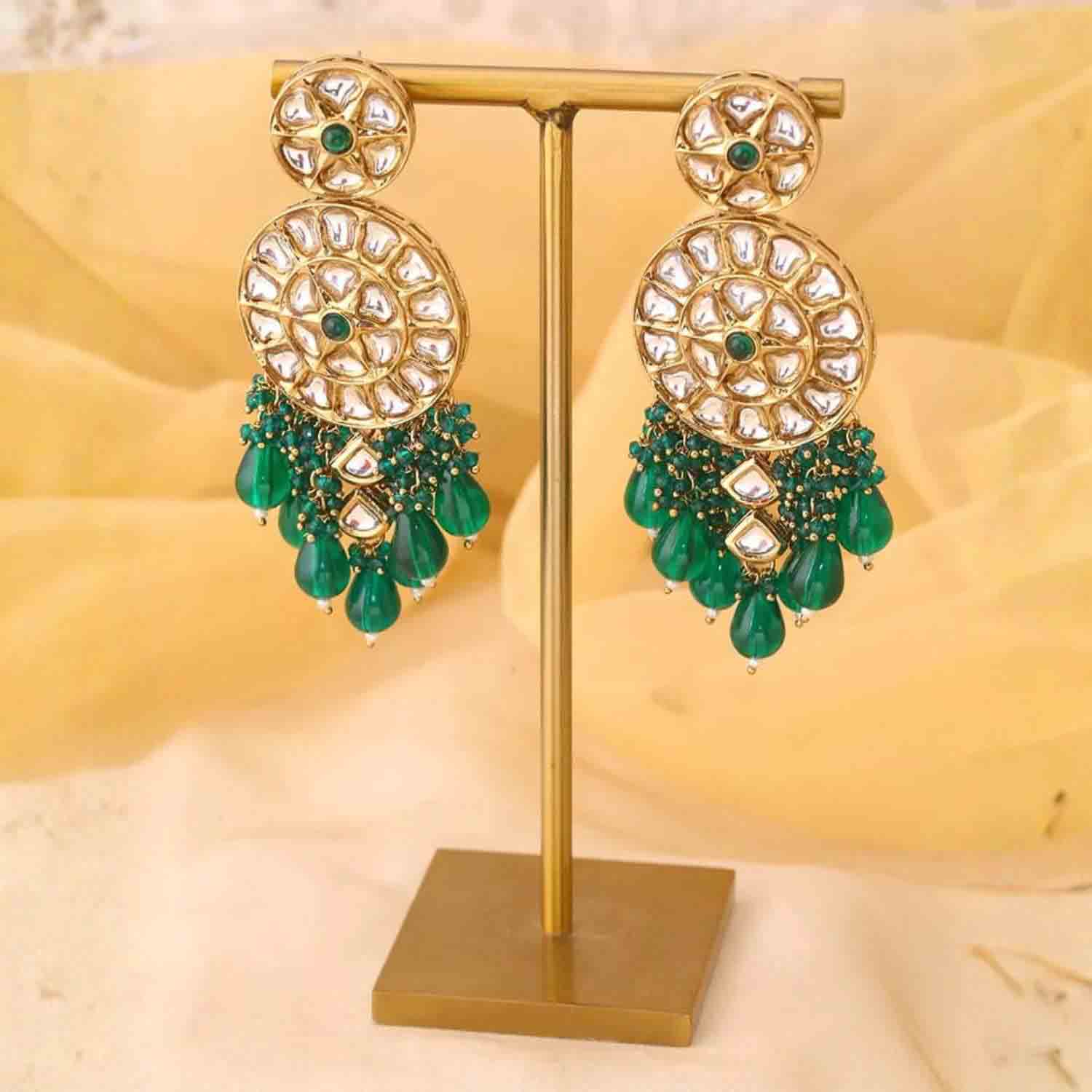 💚 Statement Kundan Earrings – Intricately designed with mirror-cut stones and deep green bead drops for a royal touch.