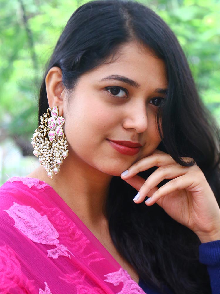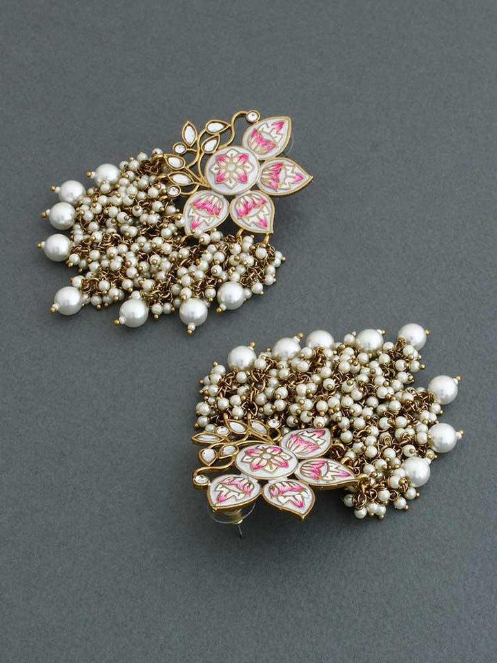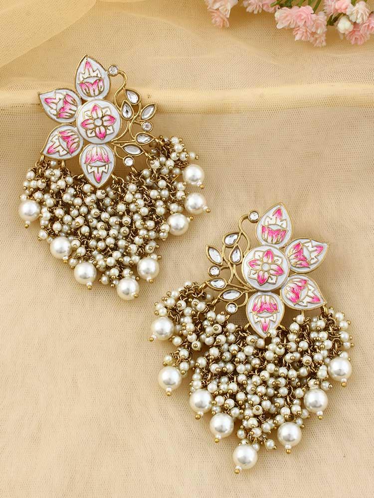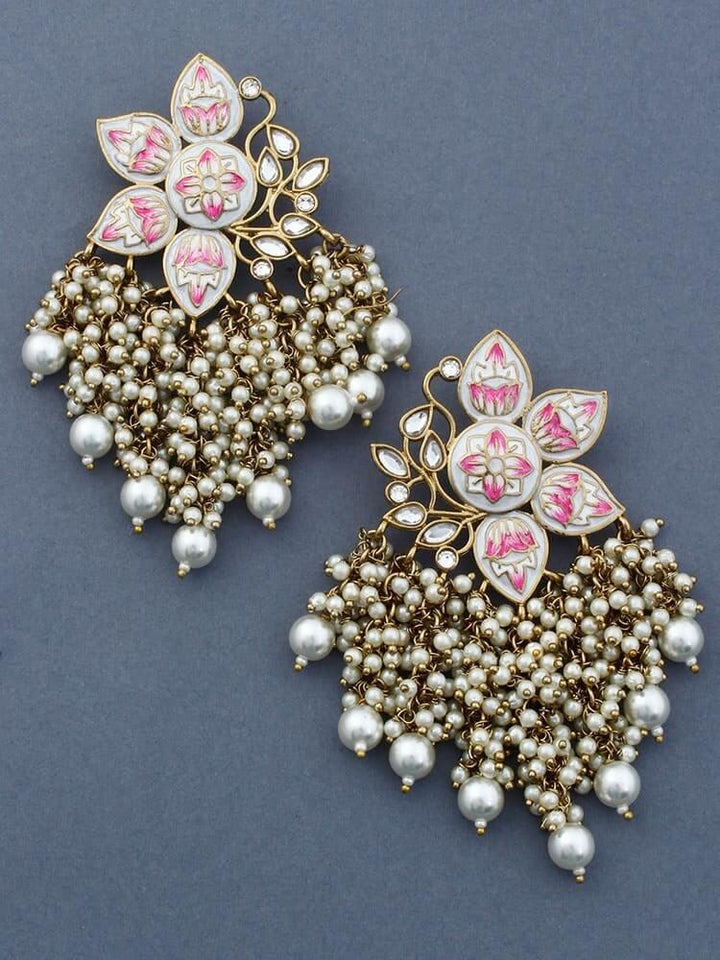 These are a gorgeous pair of earrings with a beautiful meenakari pattern and a pearl and beads design. These are a nice dangler pattern. They are a hot favorite this party season