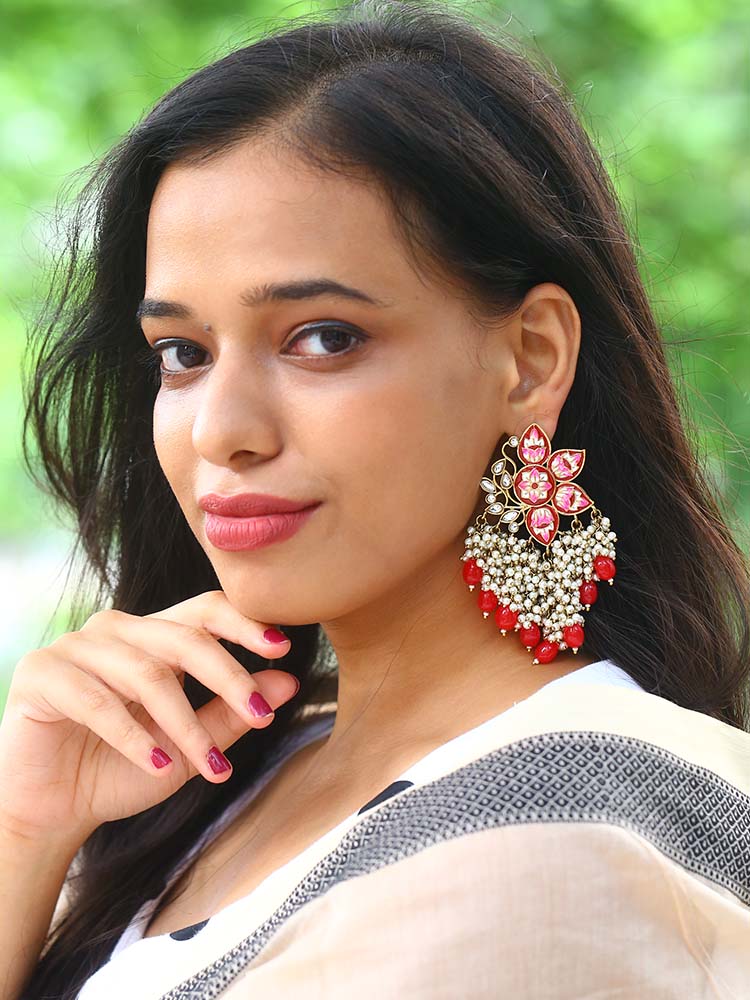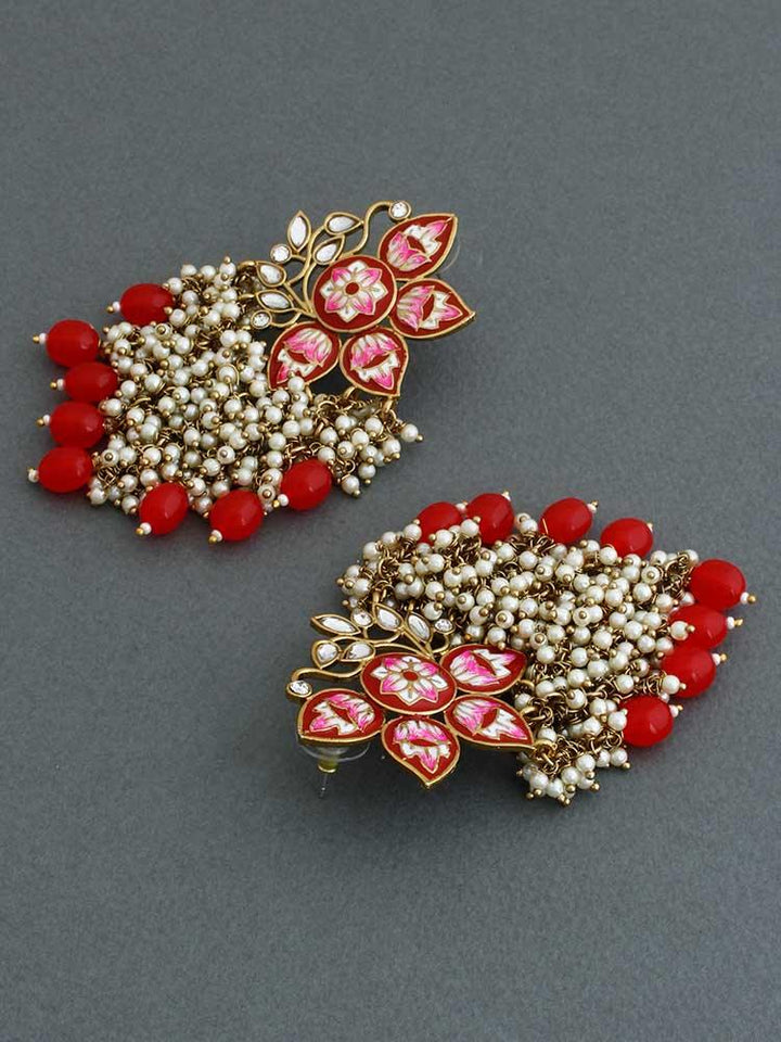 These are a gorgeous pair of earrings with a beautiful meenakari pattern and a pearl and beads design. These are a nice dangler pattern. They are a hot favorite this party season