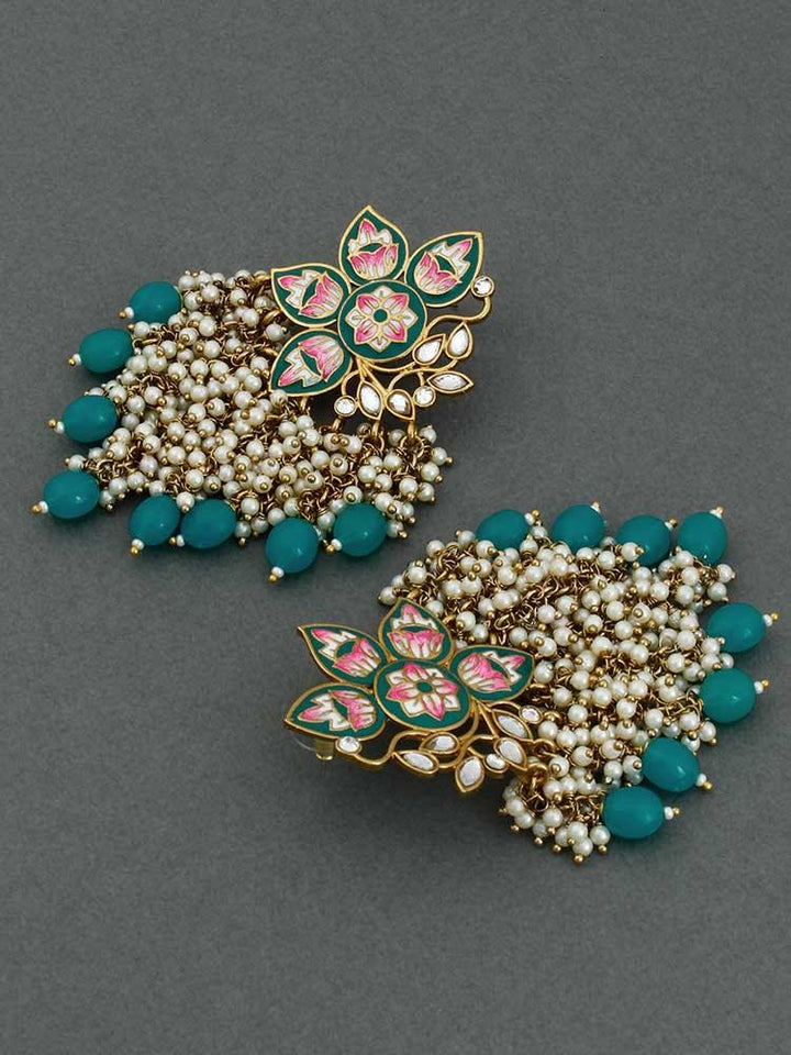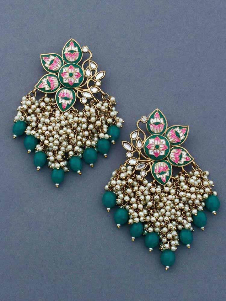 These are a gorgeous pair of earrings with a beautiful meenakari pattern and a pearl and beads design. These are a nice dangler pattern. They are a hot favorite this party season