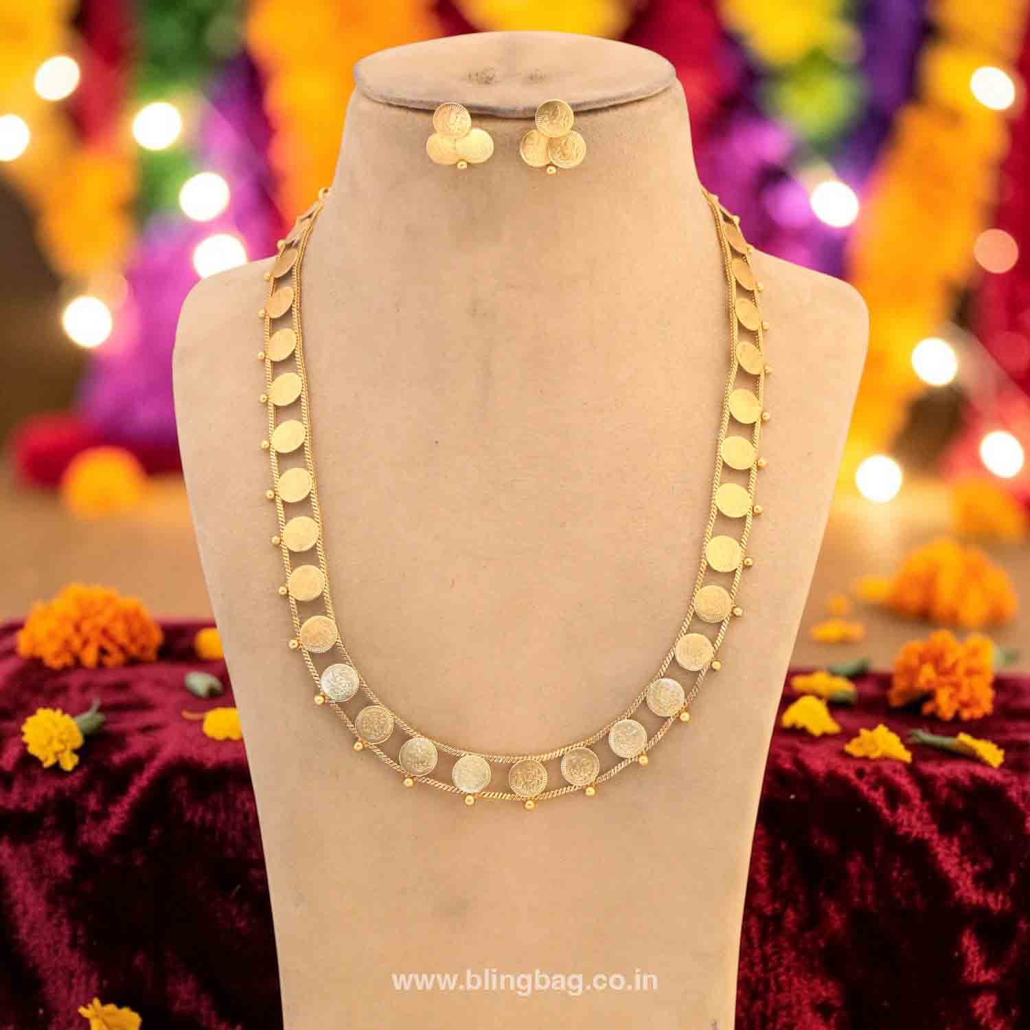The temple necklace set epitomizes the grandeur and spiritual essence of Indian heritage, blending divine motifs with exquisite craftsmanship. Crafted with precision, each piece in the set showcases a harmonious blend of tradition and elegance.