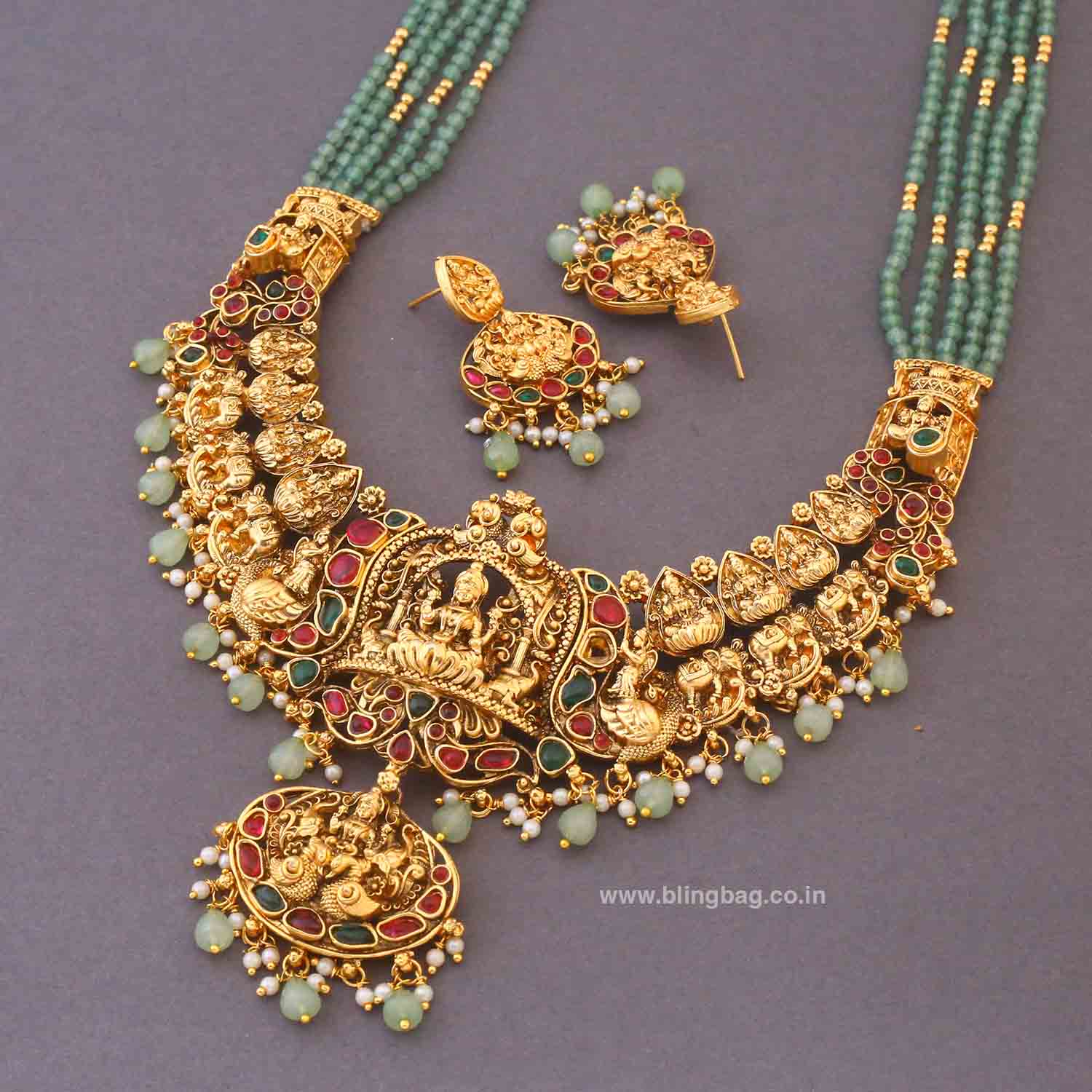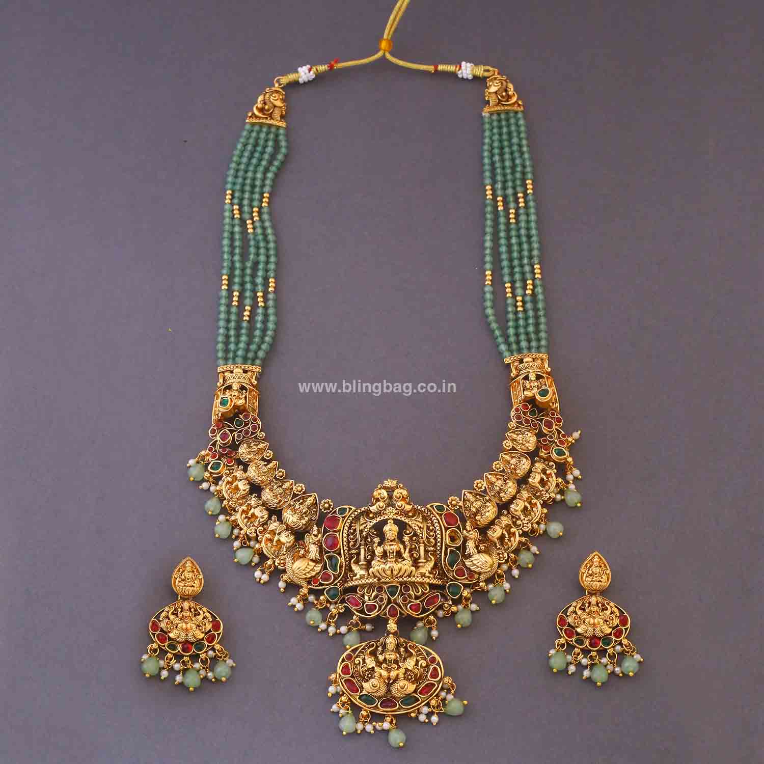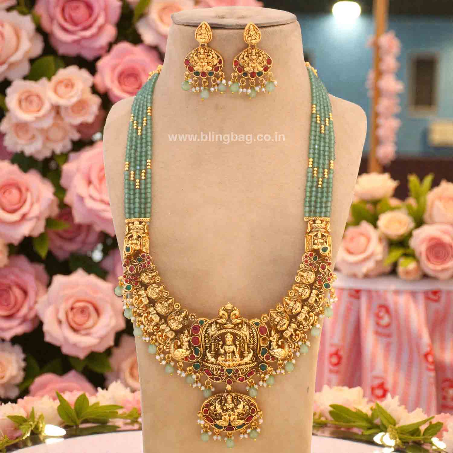 This exquisite temple jewellery set showcases a grand handcrafted necklace adorned with a richly detailed central goddess motif. The necklace is beautifully finished with layered green bead strands and intricate gold-toned work, highlighted with ruby-colored accents and delicate bead drops. The matching earrings mirror the same traditional design, completing the regal look.