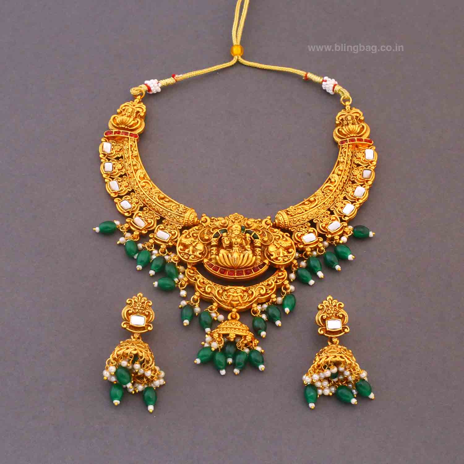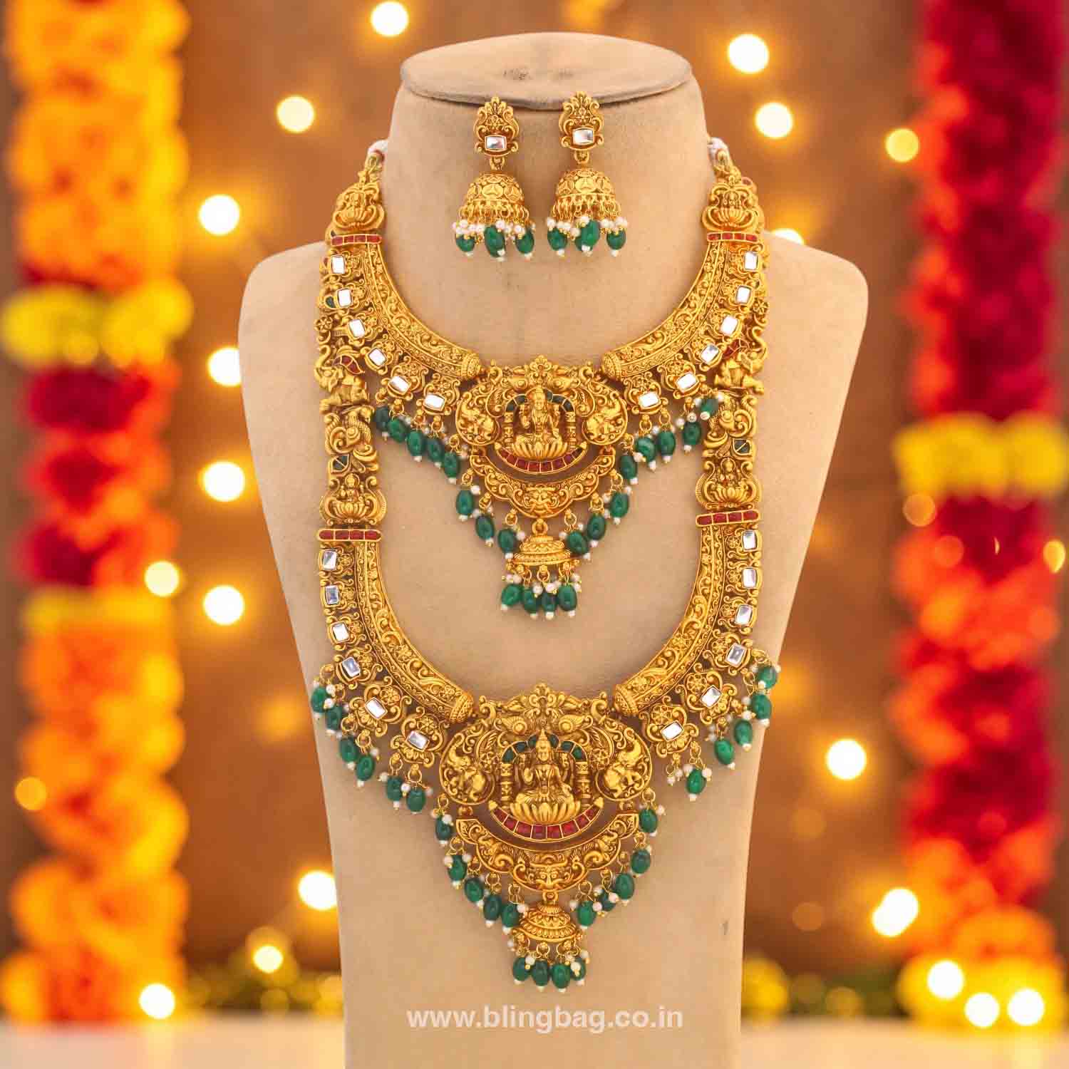 The temple necklace set epitomizes the grandeur and spiritual essence of Indian heritage, blending divine motifs with exquisite craftsmanship. Crafted with precision, each piece in the set showcases a harmonious blend of tradition and elegance.