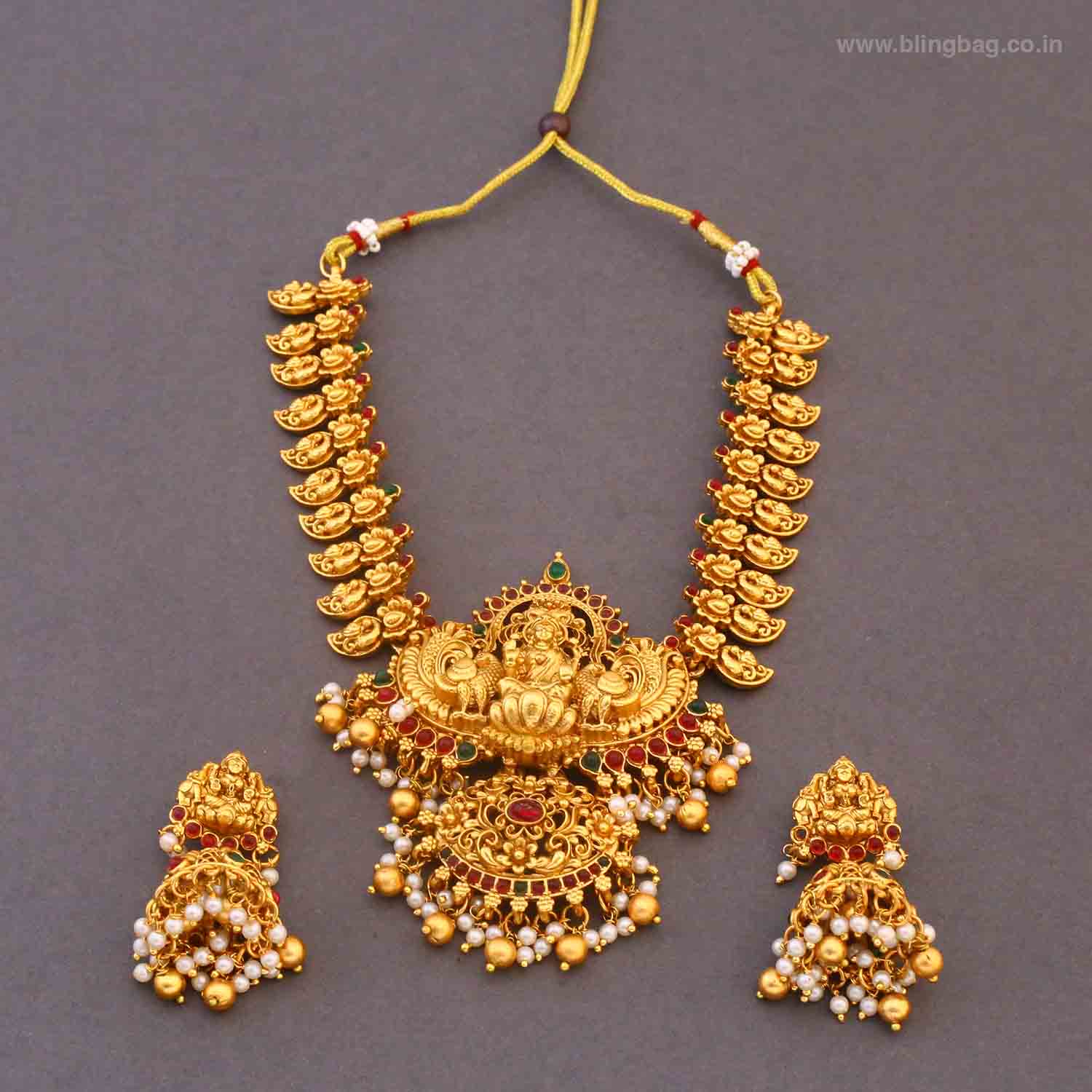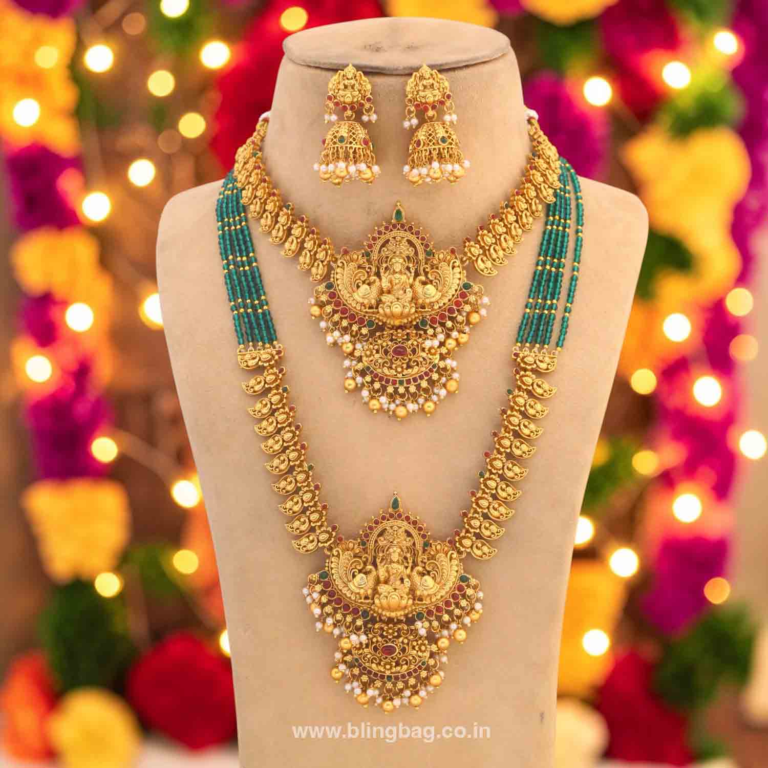 The temple necklace set epitomizes the grandeur and spiritual essence of Indian heritage, blending divine motifs with exquisite craftsmanship. Crafted with precision, each piece in the set showcases a harmonious blend of tradition and elegance.