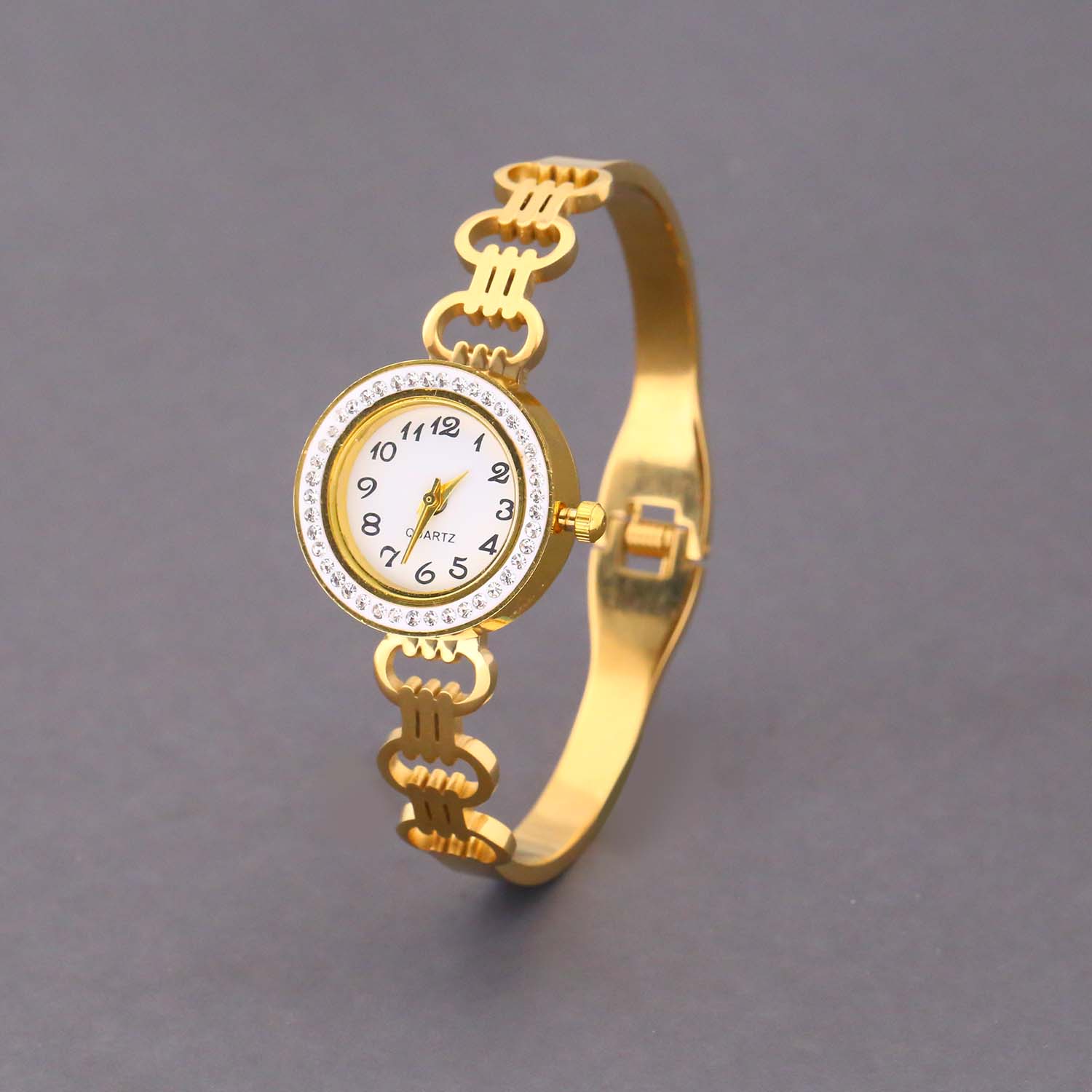 Adorn your wrist with the elegance of the Blingbag Crystal Bloom Omkari Watch. This exquisite timepiece features a delicate, jewelry-inspired gold-plated bangle strap with intricate cutout details, transitioning into a small, round watch face. The dial is framed by a dazzling bezel fully encrusted with sparkling white crystals, while the clean, white watch face with black numerals offers a blend of classic timekeeping and luxurious style. Its bracelet-like design makes it a statement accessory that perfectly complements both ethnic and contemporary attire.