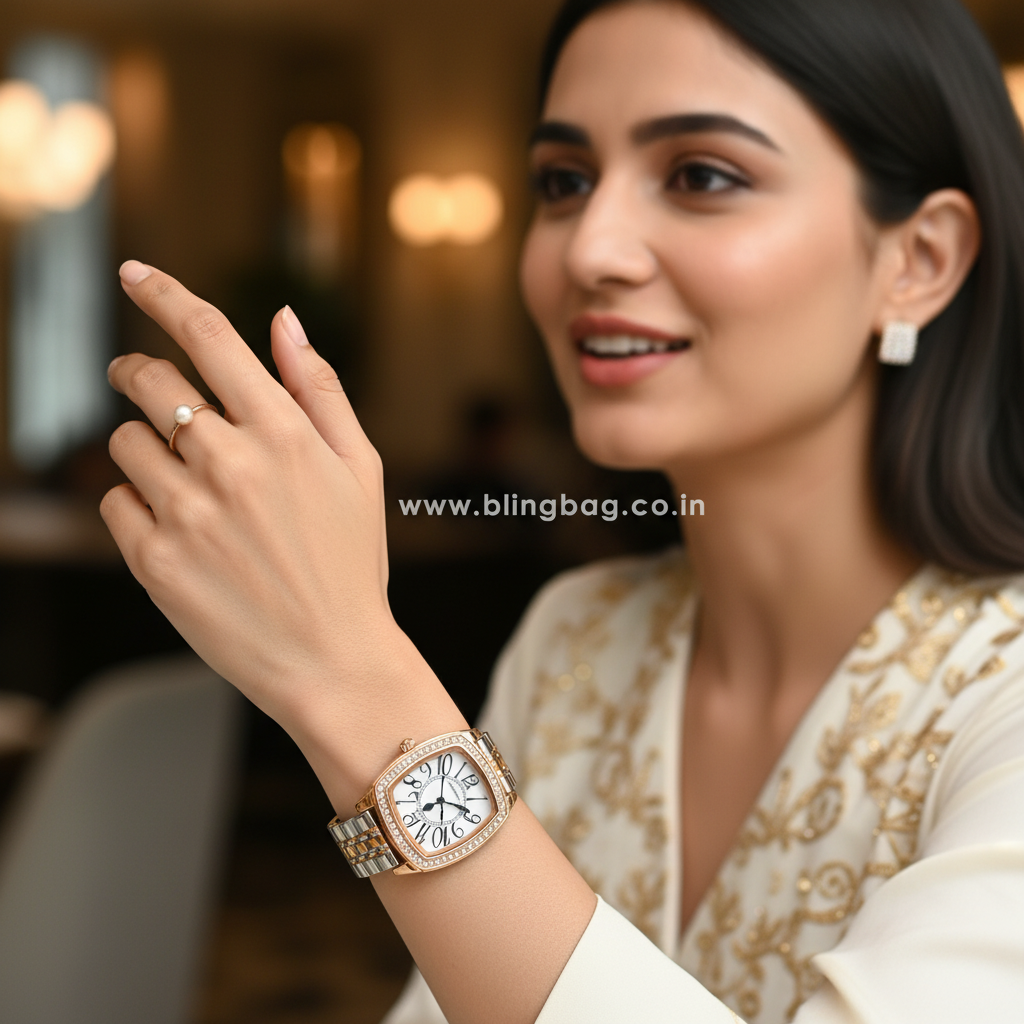 The Blingbag Diamond Barrel Ena Watch is a statement of refined elegance and everyday glamour. Designed with a distinctive barrel-shaped dial framed by sparkling stones, it perfectly balances sophistication with a touch of luxury. The dual-tone strap adds a modern twist, making it a versatile choice for both festive occasions and daily wear.