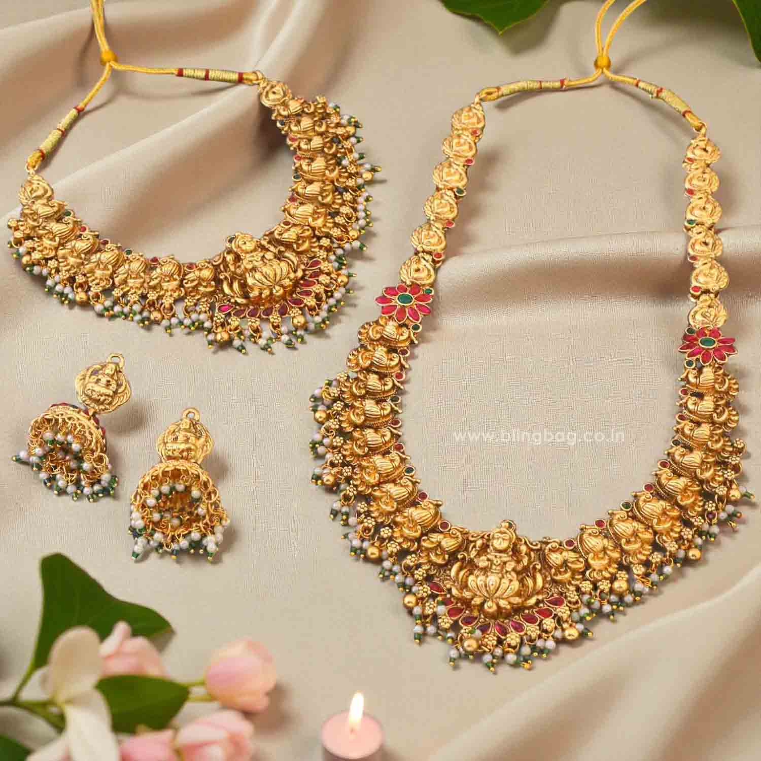 The temple necklace set epitomizes the grandeur and spiritual essence of Indian heritage, blending divine motifs with exquisite craftsmanship. Crafted with precision, each piece in the set showcases a harmonious blend of tradition and elegance.
