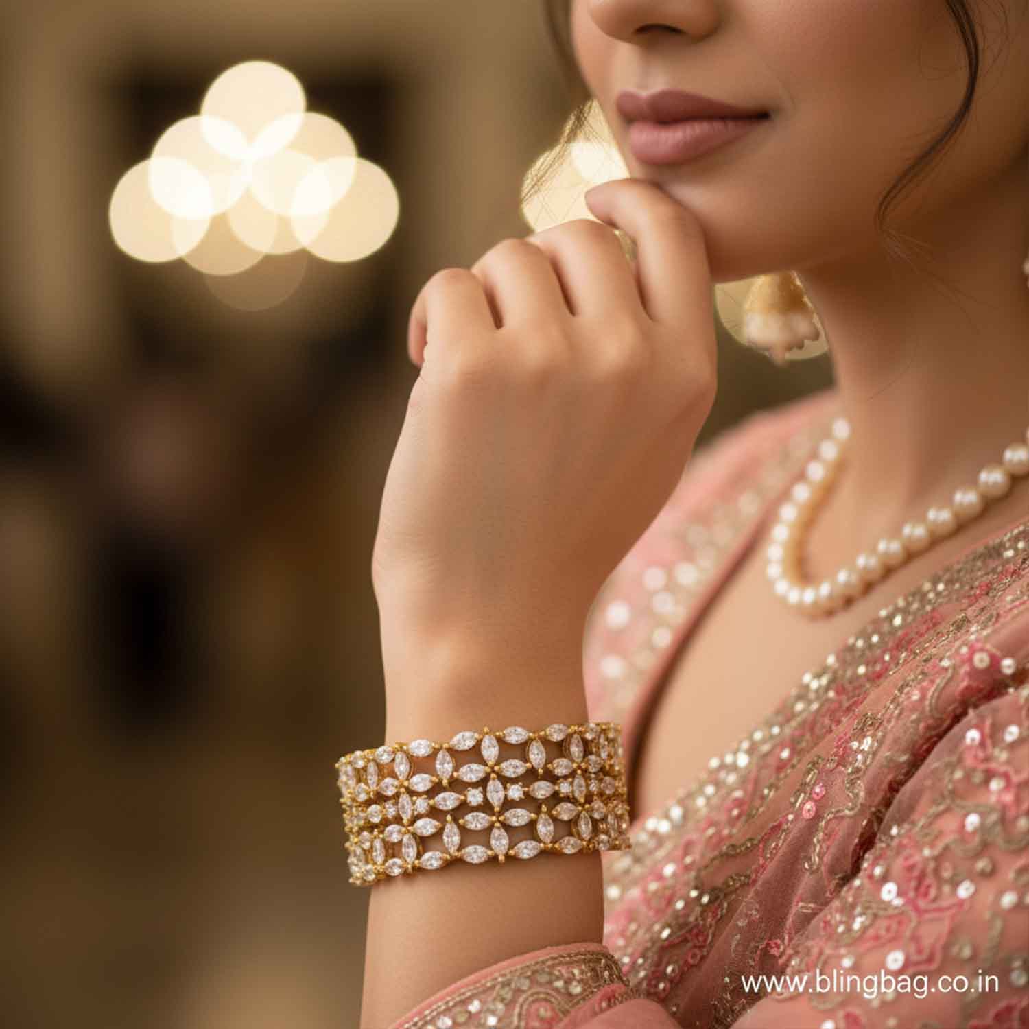 This elegant gold-toned kada bracelet features a rich lattice design adorned with sparkling kundan-style stones. The layered setting creates a luxurious, textured look, while the broad silhouette gives it a bold yet graceful appeal. The intricate craftsmanship ensures a perfect balance of tradition and sophistication.
