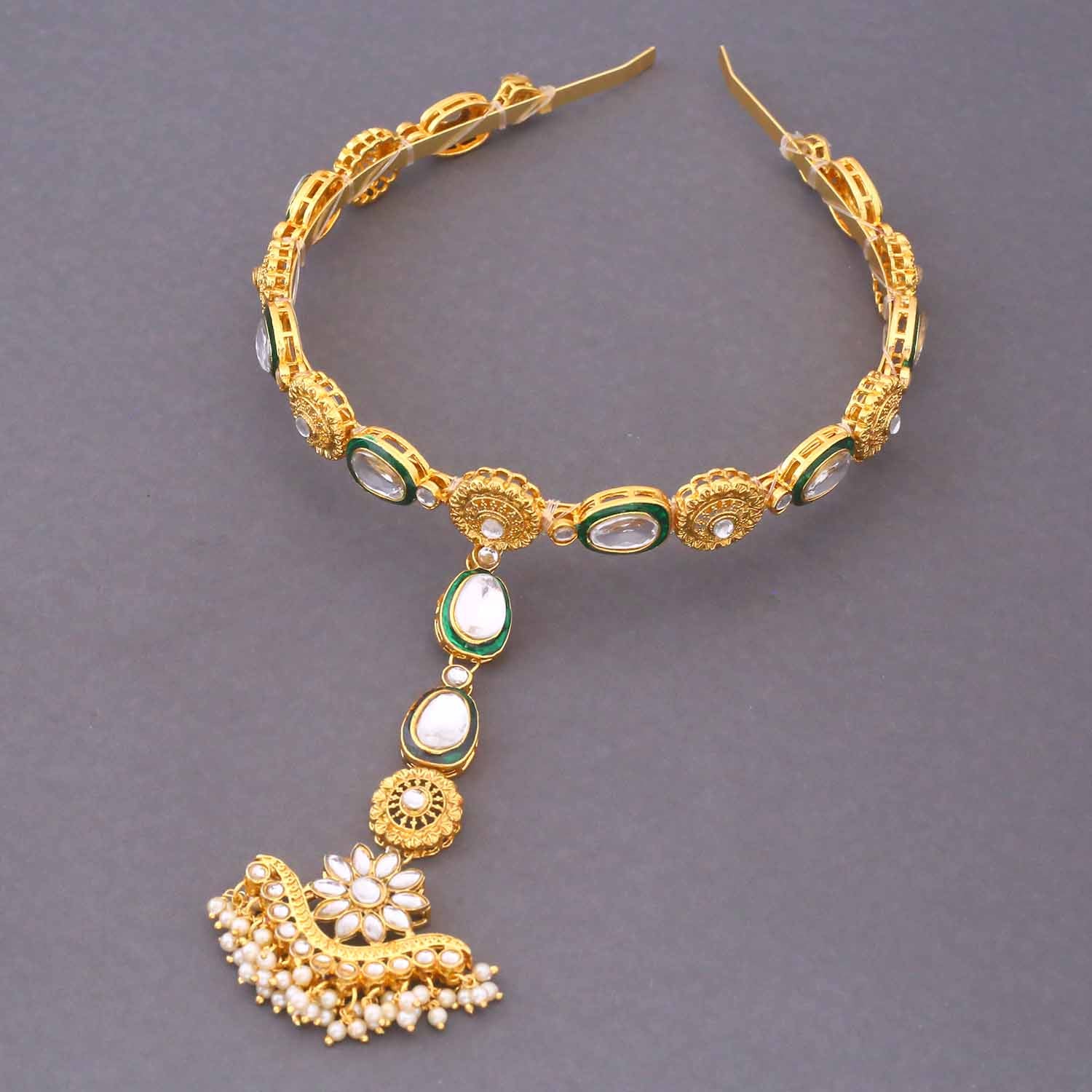 Designed to exude royal elegance, this head band with tikka is a fusion of traditional charm and modern aesthetics. Adorned with intricate details, it gracefully complements bridal and festive looks, making it an essential accessory for grand occasions.