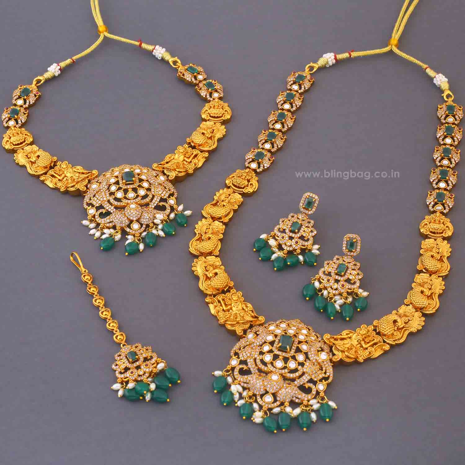 The temple necklace set epitomizes the grandeur and spiritual essence of Indian heritage, blending divine motifs with exquisite craftsmanship. Crafted with precision, each piece in the set showcases a harmonious blend of tradition and elegance.