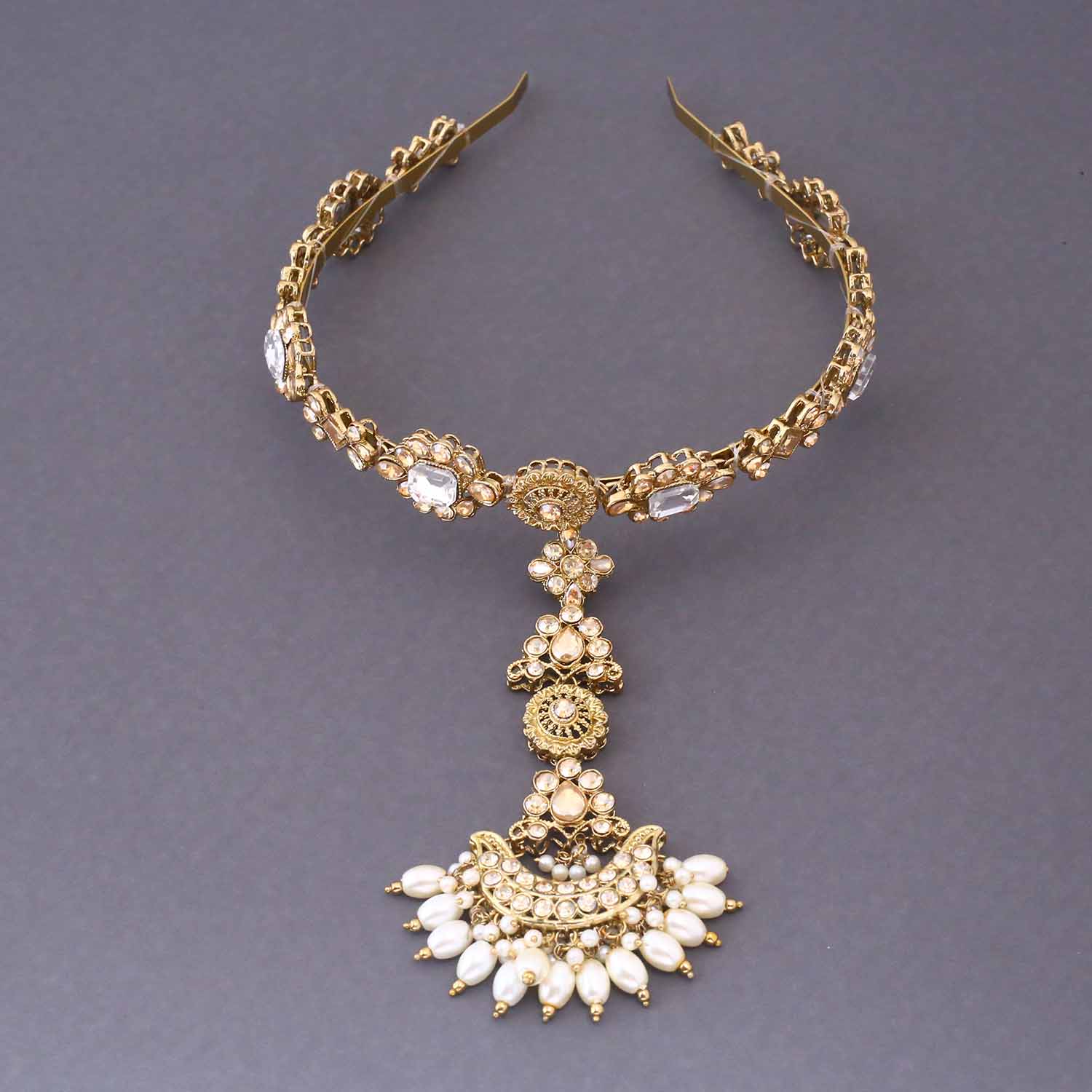 Designed to exude royal elegance, this head band with tikka is a fusion of traditional charm and modern aesthetics. Adorned with intricate details, it gracefully complements bridal and festive looks, making it an essential accessory for grand occasions.