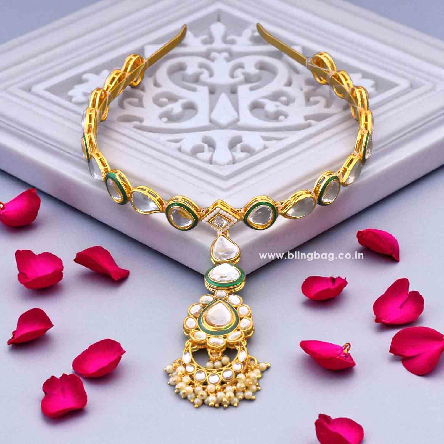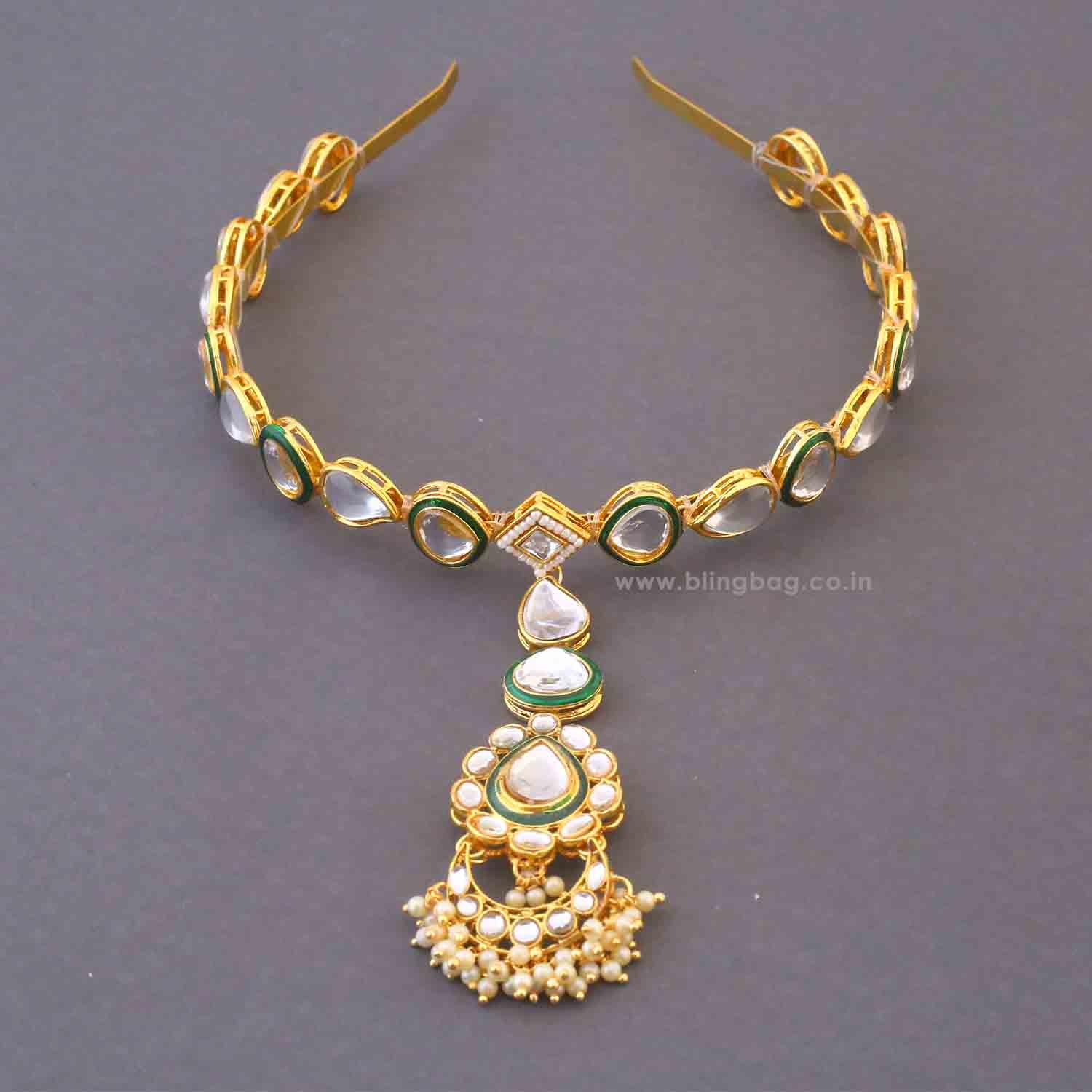 Designed to exude royal elegance, this headband with a tikka is a fusion of traditional charm and modern aesthetics. Adorned with intricate details, it gracefully complements bridal and festive looks, making it an essential accessory for grand occasions.