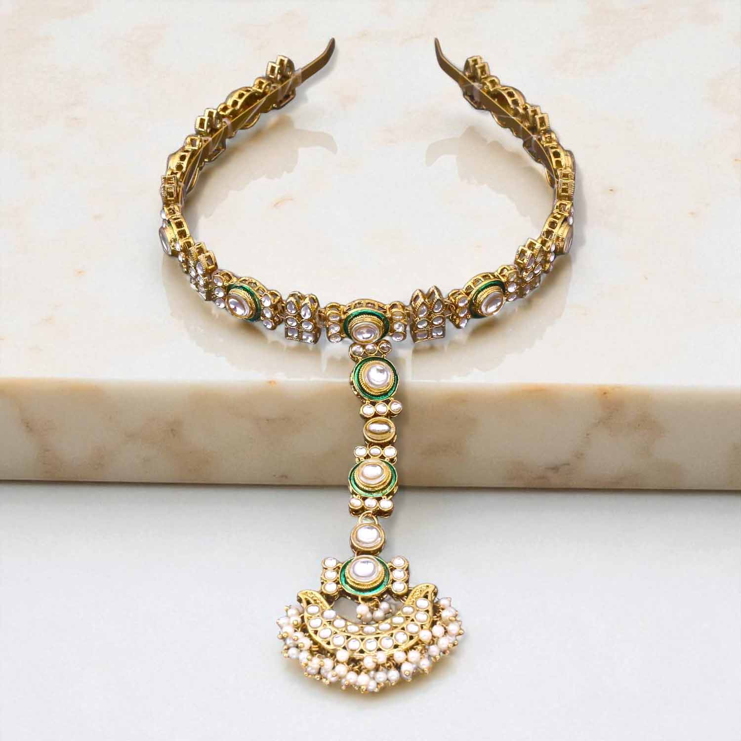 Designed to exude royal elegance, this head band with tikka is a fusion of traditional charm and modern aesthetics. Adorned with intricate details, it gracefully complements bridal and festive looks, making it an essential accessory for grand occasions.