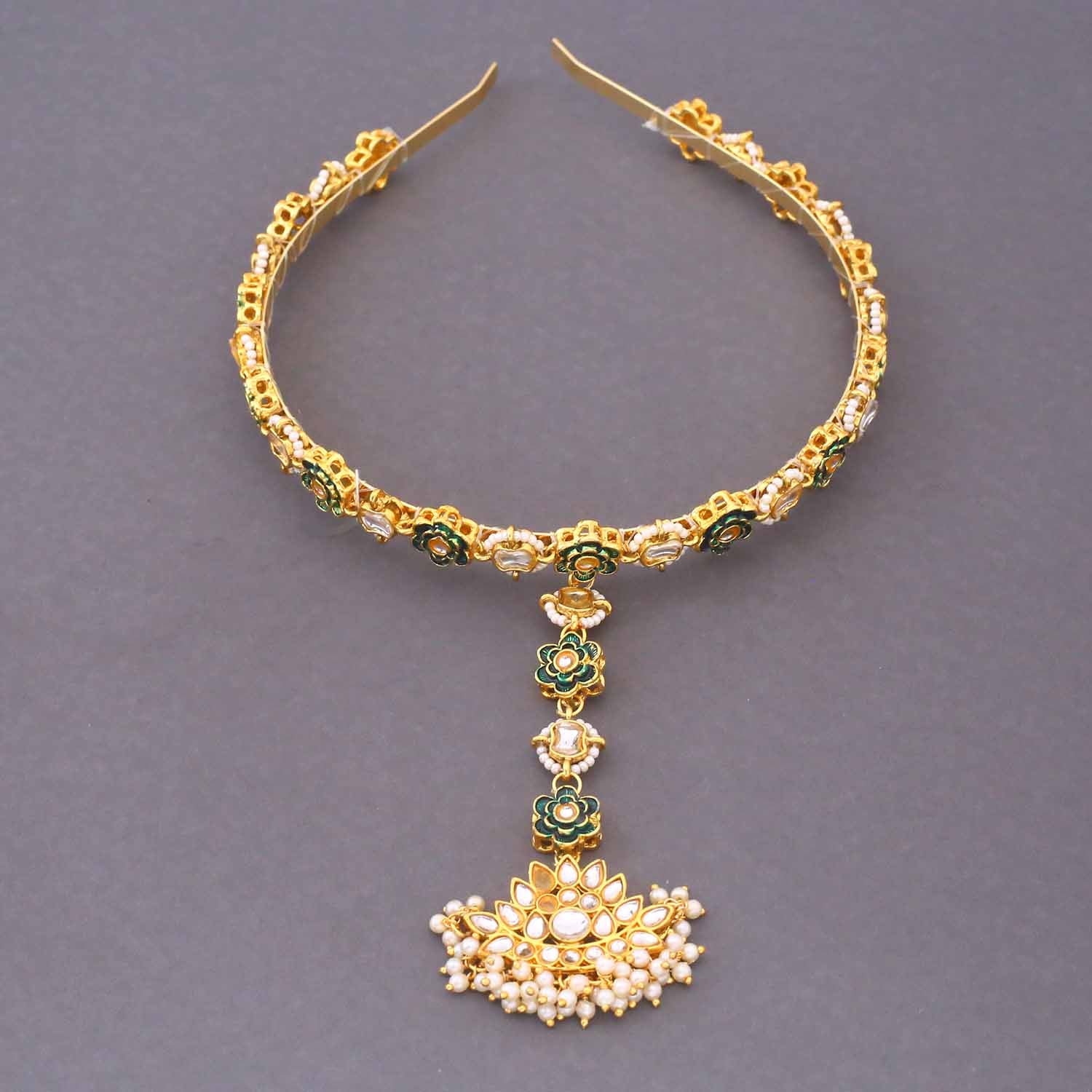 Designed to exude royal elegance, this head band with tikka is a fusion of traditional charm and modern aesthetics. Adorned with intricate details, it gracefully complements bridal and festive looks, making it an essential accessory for grand occasions.