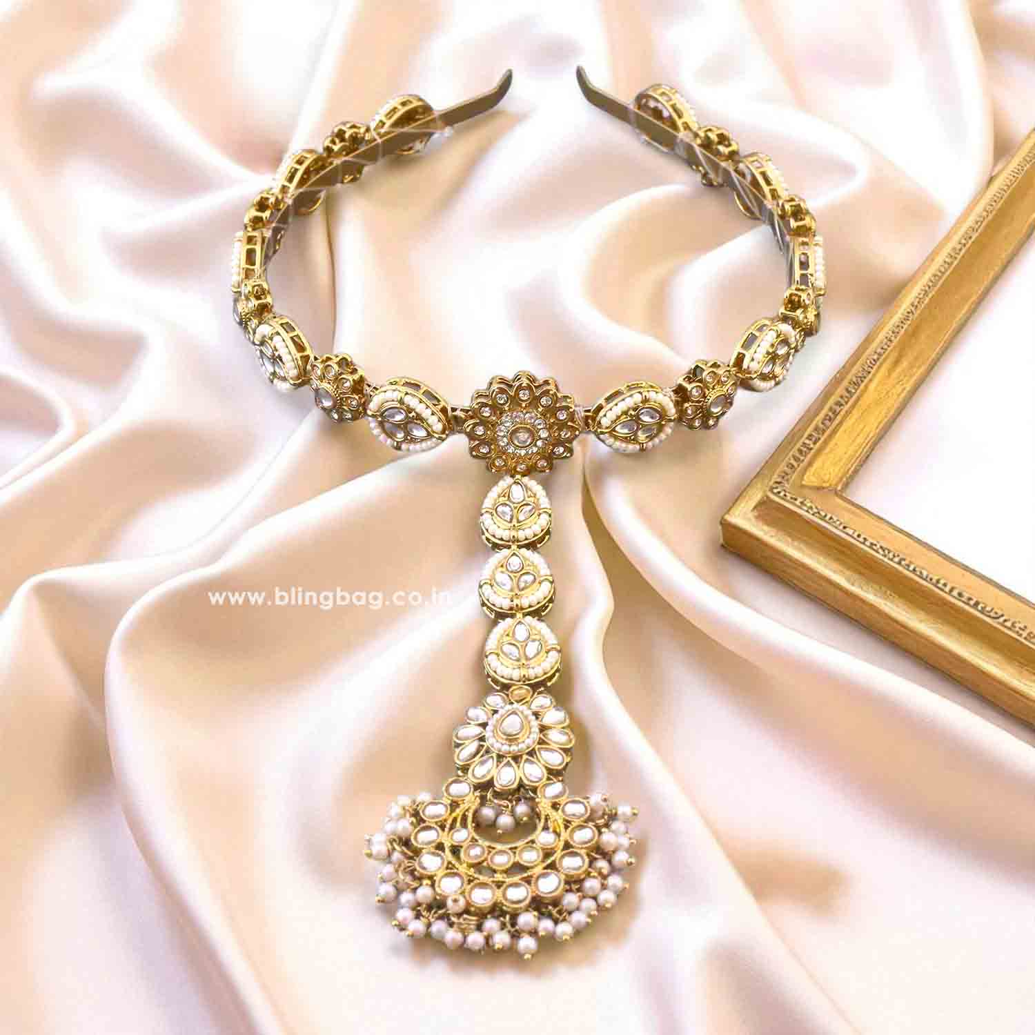 Designed to exude royal elegance, this head band with tikka is a fusion of traditional charm and modern aesthetics. Adorned with intricate details, it gracefully complements bridal and festive looks, making it an essential accessory for grand occasions.