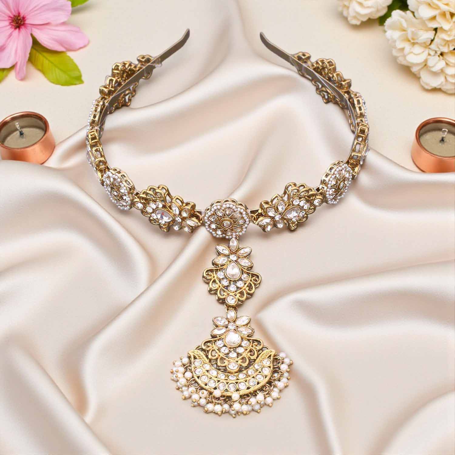 Designed to exude royal elegance, this head band with tikka is a fusion of traditional charm and modern aesthetics. Adorned with intricate details, it gracefully complements bridal and festive looks, making it an essential accessory for grand occasions.