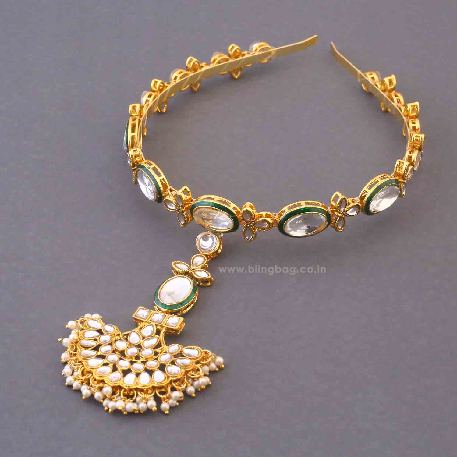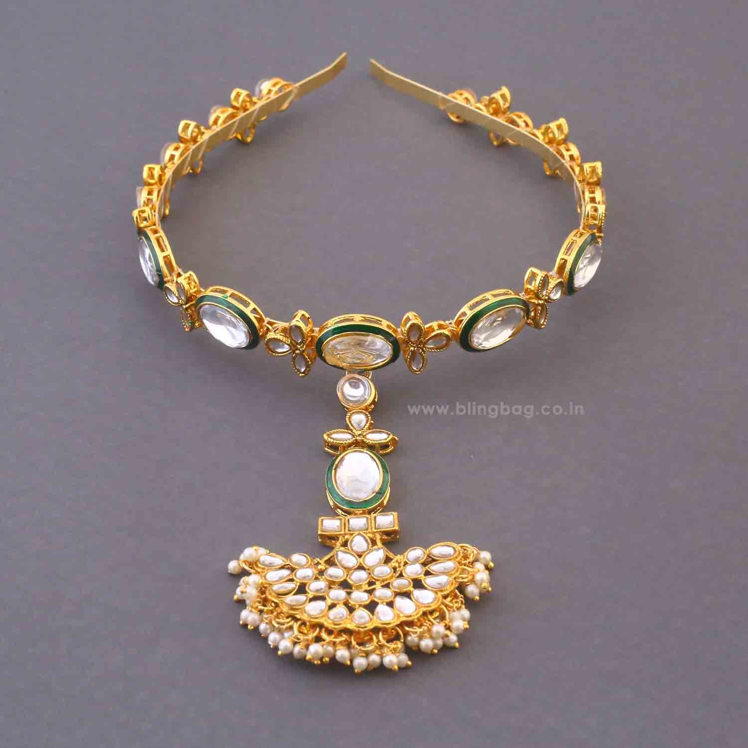 Designed to exude royal elegance, this headband with a tikka is a fusion of traditional charm and modern aesthetics. Adorned with intricate details, it gracefully complements bridal and festive looks, making it an essential accessory for grand occasions.