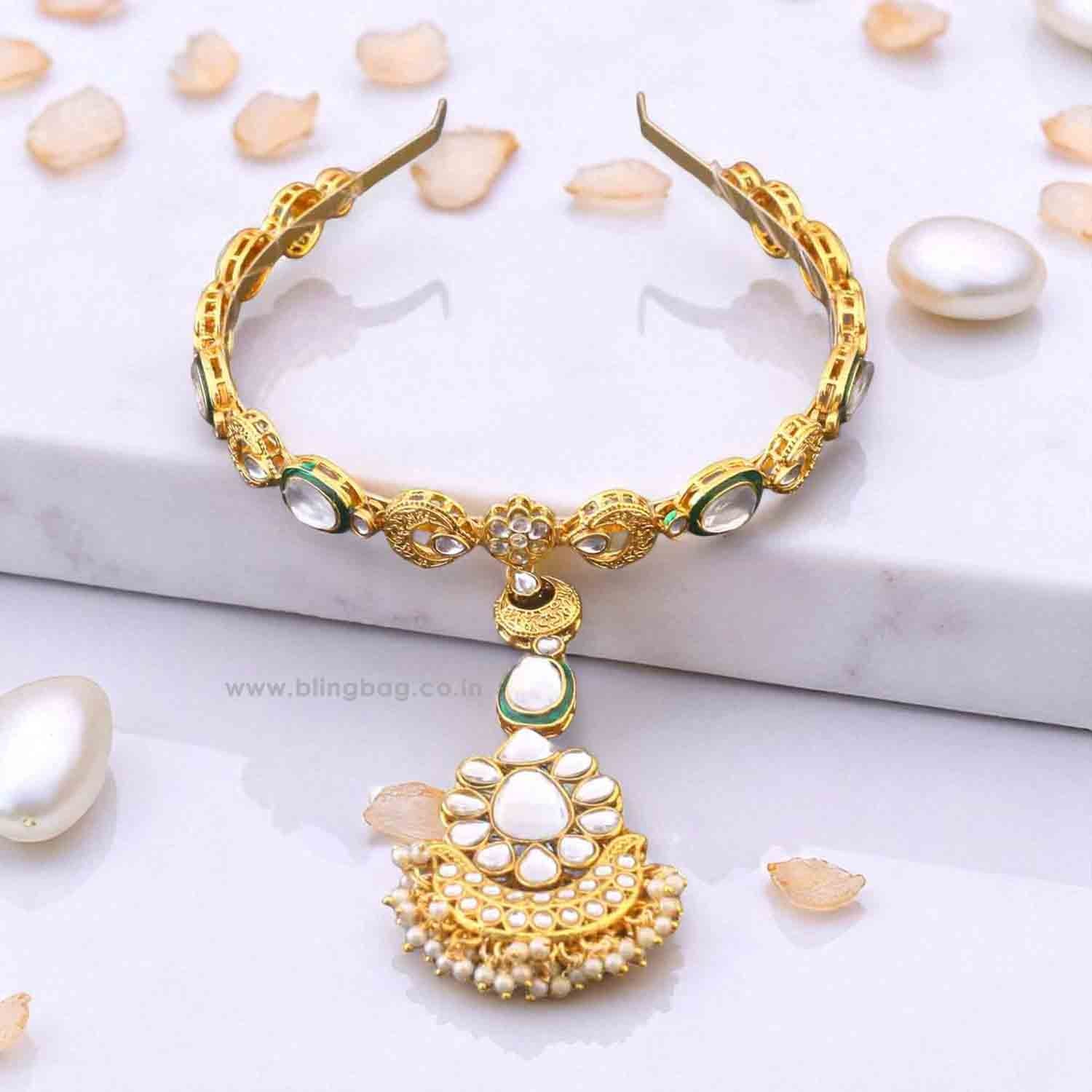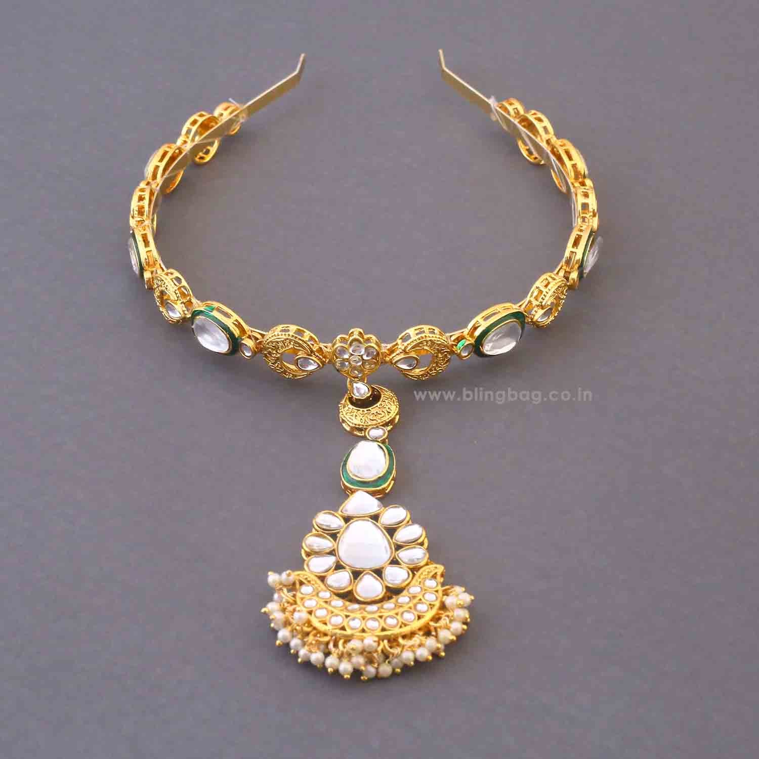 Designed to exude royal elegance, this headband with a tikka is a fusion of traditional charm and modern aesthetics. Adorned with intricate details, it gracefully complements bridal and festive looks, making it an essential accessory for grand occasions.