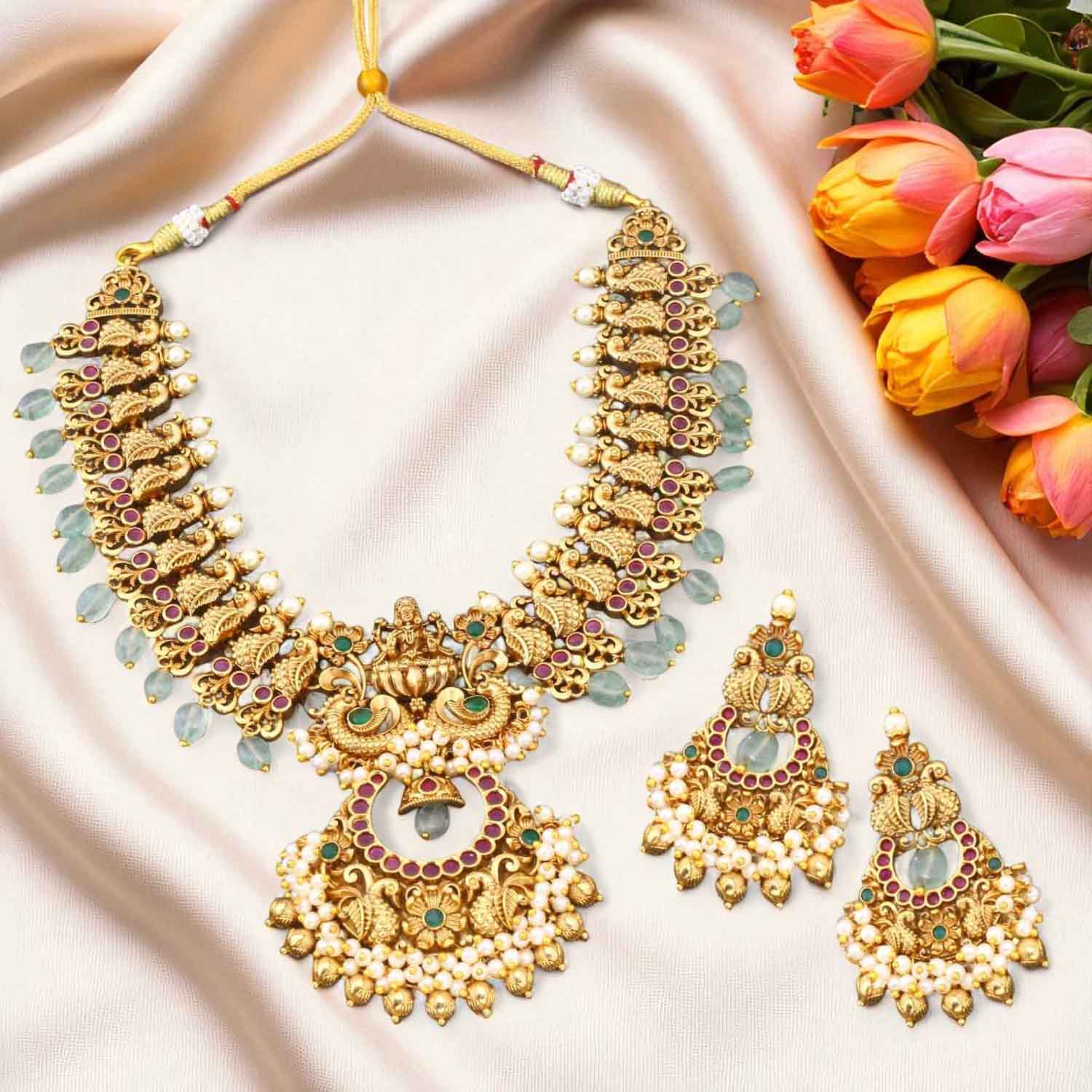 The temple necklace set epitomizes the grandeur and spiritual essence of Indian heritage, blending divine motifs with exquisite craftsmanship. Crafted with precision, each piece in the set showcases a harmonious blend of tradition and elegance.