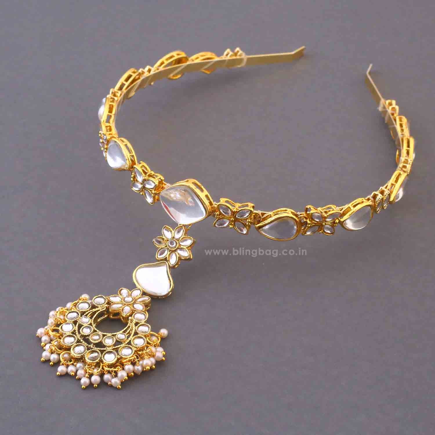 Designed to exude royal elegance, this headband with a tikka is a fusion of traditional charm and modern aesthetics. Adorned with intricate details, it gracefully complements bridal and festive looks, making it an essential accessory for grand occasions.